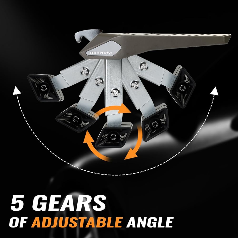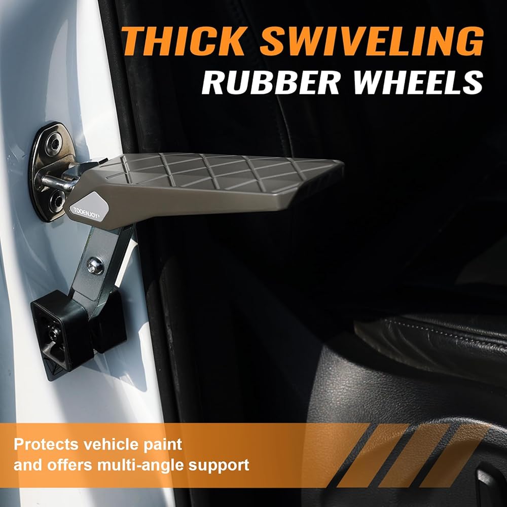 Stable and Flexible: Aircraft-grade aluminum makes this car door step lightweight and sturdy, max load 400 lbs. 5-gear design provides 5 different angles that adapt to different door frames, and thick rubber wheels can protect your vehicle's paint