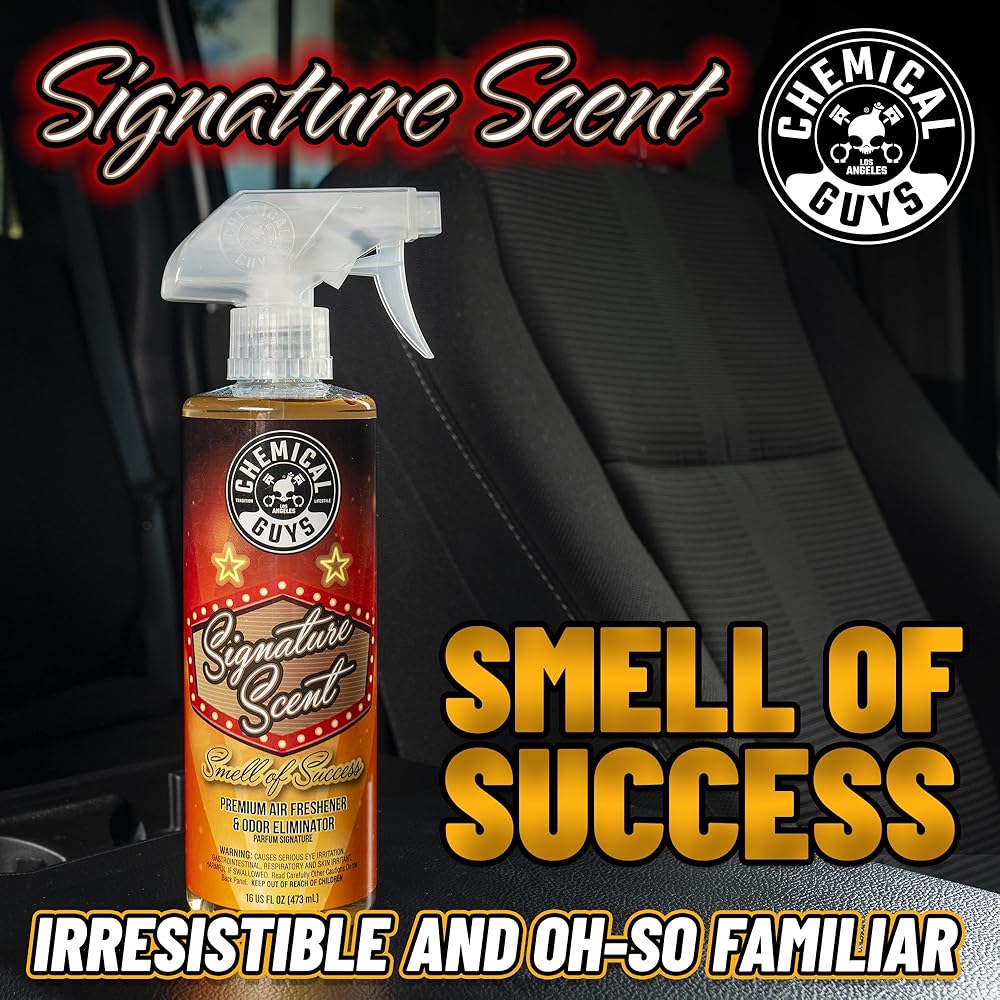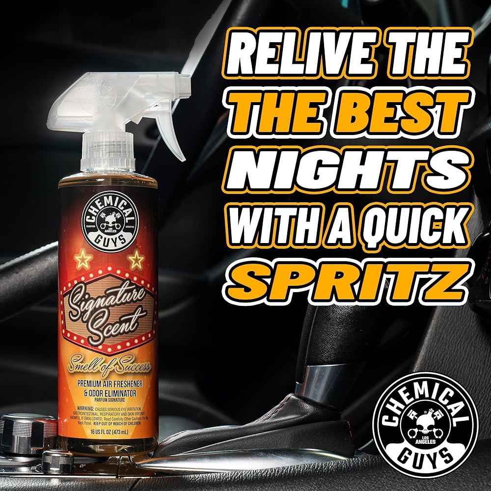 Chemical Guys Signature Scent - the ultimate air freshener for a refreshing ride! With just one spray, this premium air freshener eliminates foul odors and replaces them with a captivating, oh-so-familiar fragrance. Each whiff of this fun fragrance evokes memories made on the shiny brass poles and in the shadowy private booths of elegant clubs Versatile and easy to use, you can enjoy Signature Scent not only in your car but also at home, in the office, or anywhere that needs a delightful aroma. The highly concentrated formula ensures a little goes a long way, making it a powerful and cost-effective solution for any space. Growing up is tough. Along the way, you may have gotten lost and forgotten what it takes to have fun. Signature Scent is for the person who lives life to the max and chooses to live in the moment to have the most fun possible! Get ready to elevate your scent game with Chemical Guys Signature Scent!