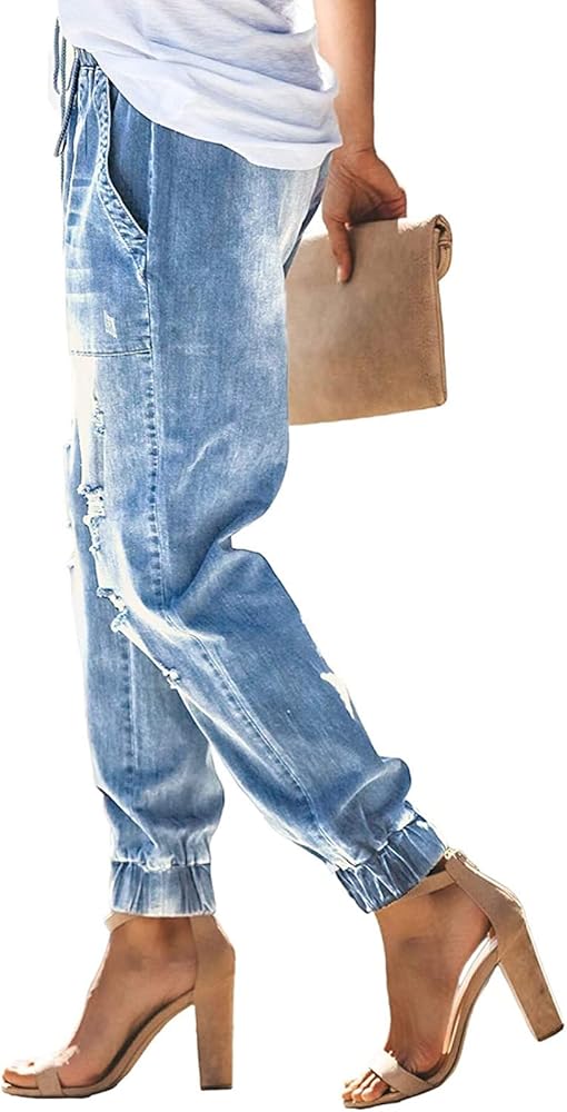 Casual jogger jeans for women with pockets,denim wash,elastic waisted with drawstring,elastic ankle always follow modern designer trends,never out of style
