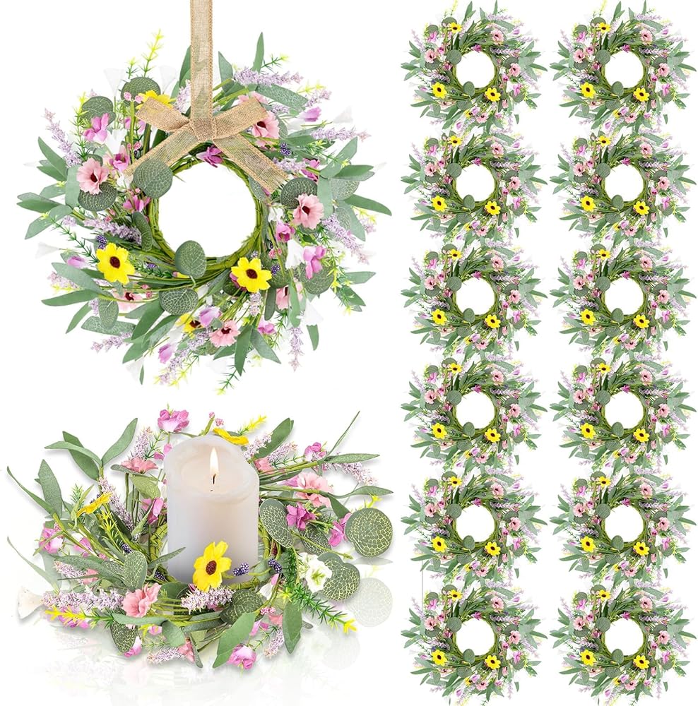 Product Description Features: Nice size for versatile use: Candle ring wreaths with an inner diameter of 3.15 inches and an outer diameter varying from 9.06 to 10.24 inches, these attractive green candle wreaths rings fit a wide array of candles. They are lightweight yet robust, encapsulating the blend of versatility and durability. The symbol of natural beauty: Our 3 inch artificial eucalyptus wreaths are primarily in a soothing shade of green, exuding a calm and relaxing ambiance. These artificial eucalyptus leaves wreaths are nice decorations for enhancing their home ambiance or special event aesthetics, if you enjoy decorating for various occasions, including holidays, weddings, and anniversary celebrations, and these products can be easily adjusted and manipulated to suit your needs.
