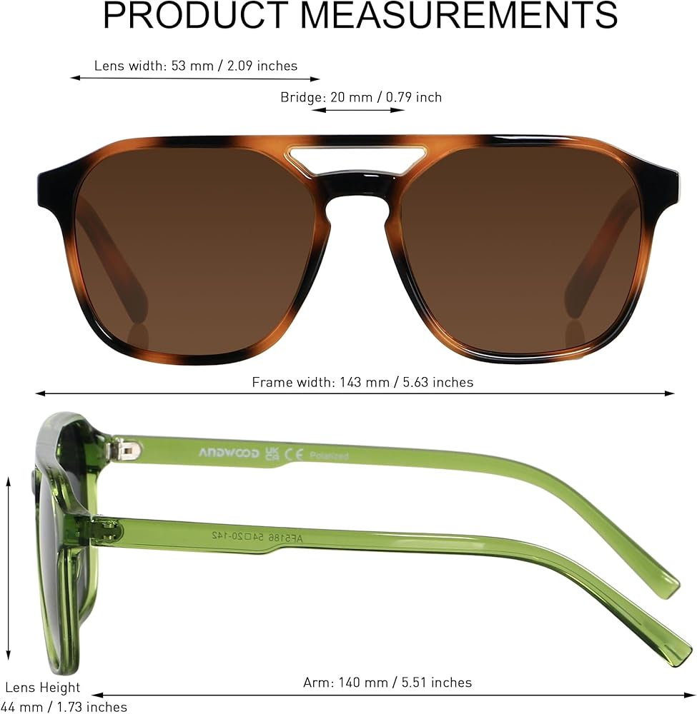 HIGH QUALITY - ANDWOOD Double-Bridge Aviator Sunglasses used lightweight plastic material have a durable frame. The unisex trendy design suitable for both men and women. The rectangular shape frame makes the overall look of the sun glasses more stylish and cool.