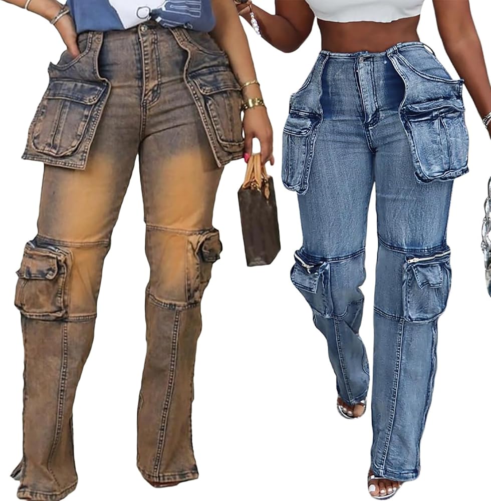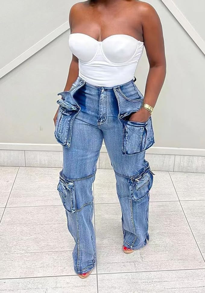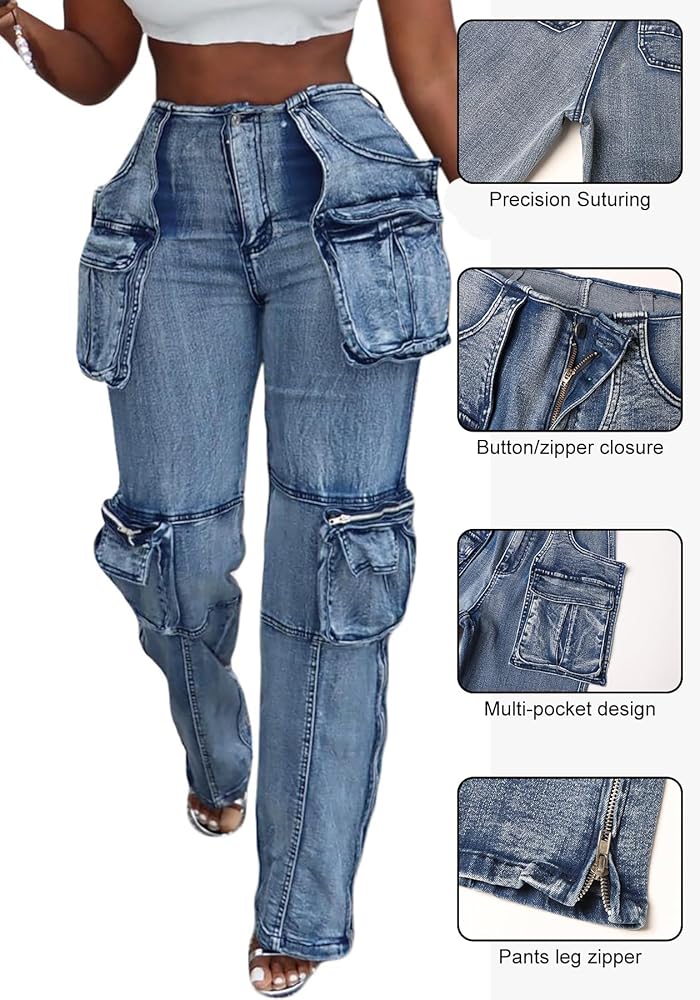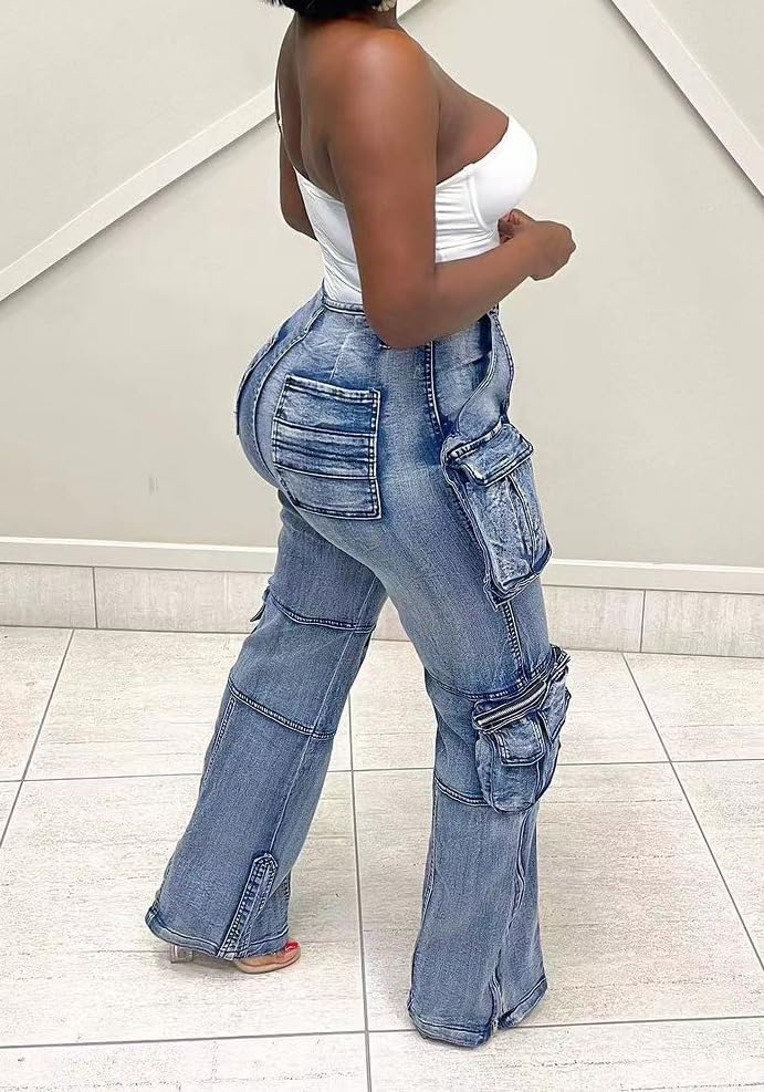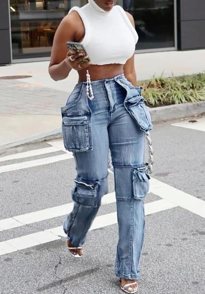 High Waist: The high-waisted design of the stretch cargo jeans helps to elongate the legs and cinch the waist, creating a proportionate silhouette and adding support