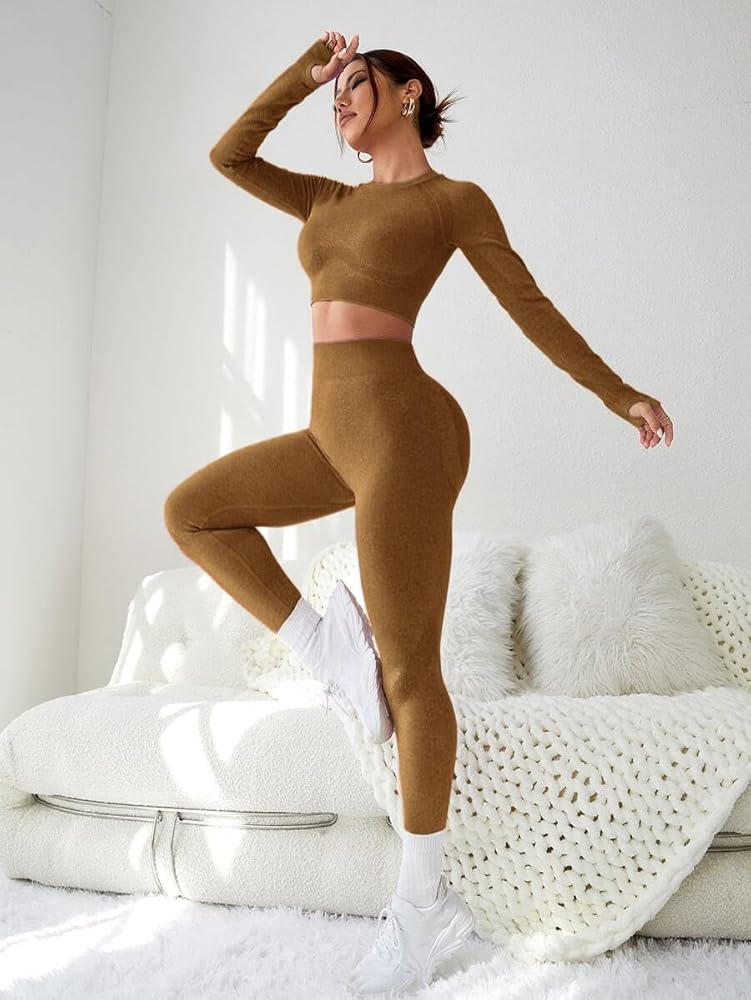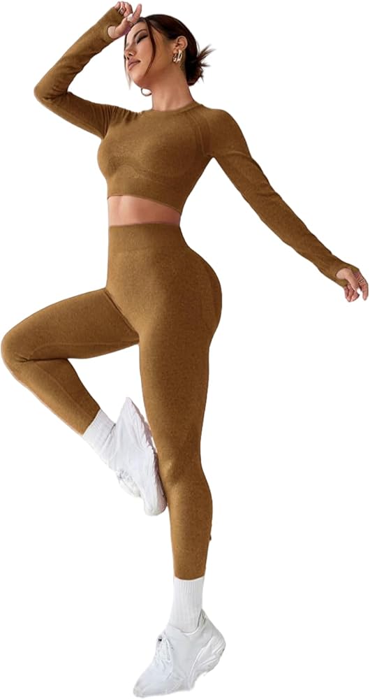 Style: Athletic slim fit professional 2 pieces yoga set, with an open back, long sleeve, cropped top and high waist, body curved leggings, stretchy and durable, comfortable to wear.