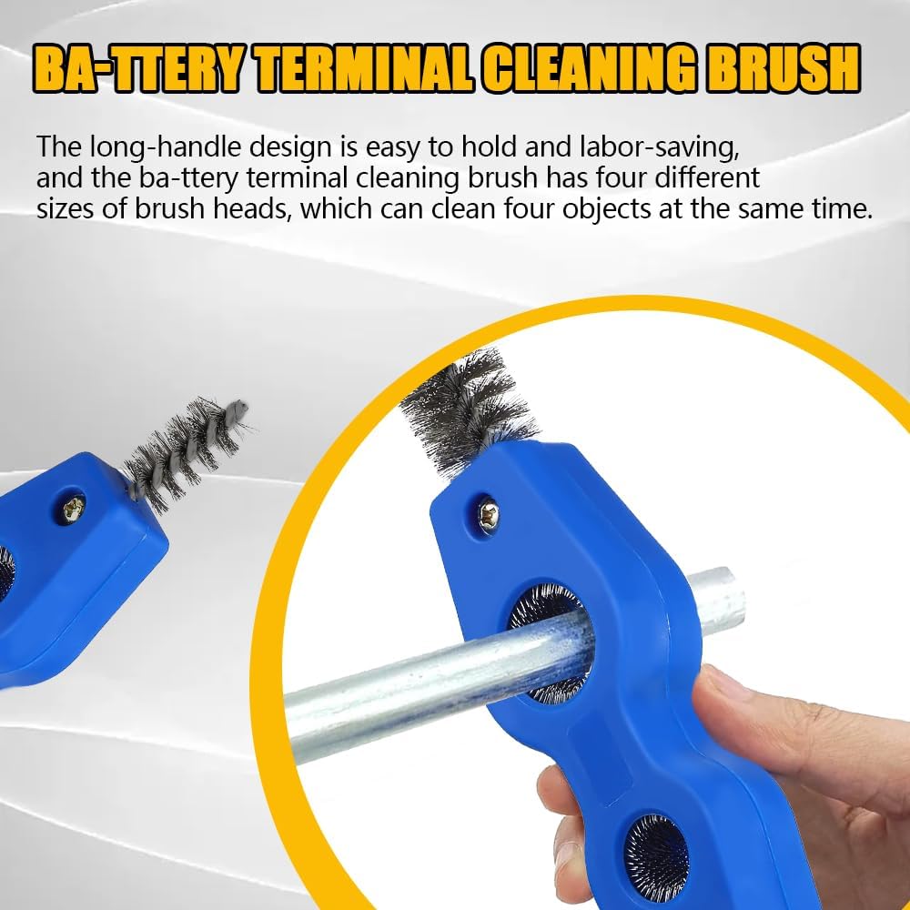 [Four-in-one design] : The terminal cleaner is designed with different sizes of brush tips at both ends, mainly used to clean the inside of the battery, which can be easily penetrated and clean impurities such as dust. In the middle part of the design of two hole brush, mainly easy to clean the battery parts of the protruding area, the surrounding terminals for more detailed brushing, cleaning is more in place