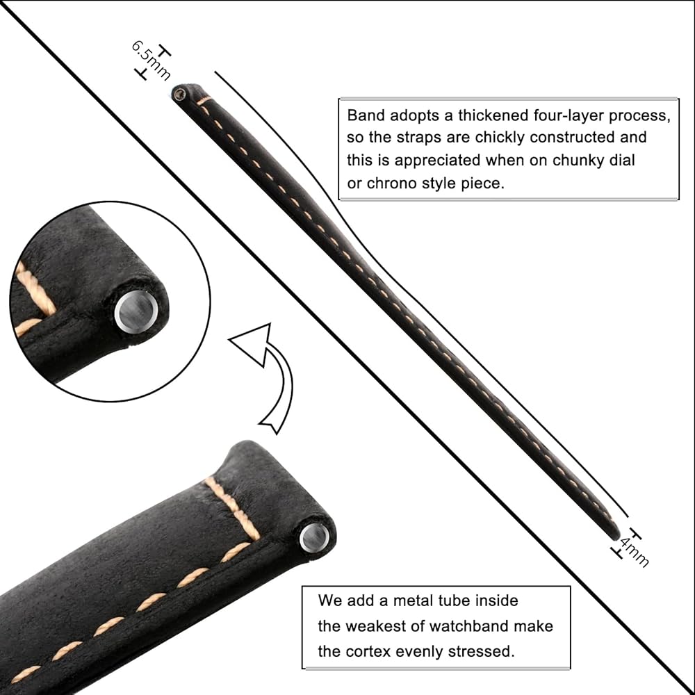 HIGH QUALITY NUBUCK: Its top layer is made of nubuck and can gives a real vintage feel to the watch when wearing. The middle layer use the padding, it adds thickness to the strap, this is appreciated when on chunky dial or chrono style piece. The back is very soft leather that feels nice on the skin, and it is waterproof leather, allowing you to do outdoor sports without any worries.