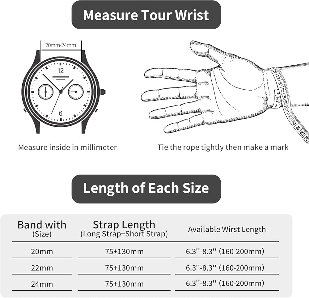 WRIST SIZE: The length of this strap is 130mm/75mm. It contains 8 small holes on the long strap and is suitable for wrists from 6.3 inches to 8.3 inches. If your wrist circumference is 7 inch, you can latch in the 3rd hole. If your wrist circumference is 7.9 inch, you can latch in the 6th hole. The geometry of the watch may affects fit, full money back guarantee for anyone that does encounter a fit issue.