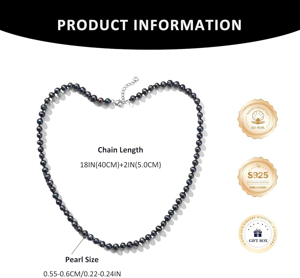 MATERIAL AND SIZE: Pearl Shape: Near-Round; Pearl Type: Saltwater Cultured Black Pearl; Pearl Size: 5.5-6.0MM; Necklace Length: 18+2IN; Metal Type: 925 Silver.