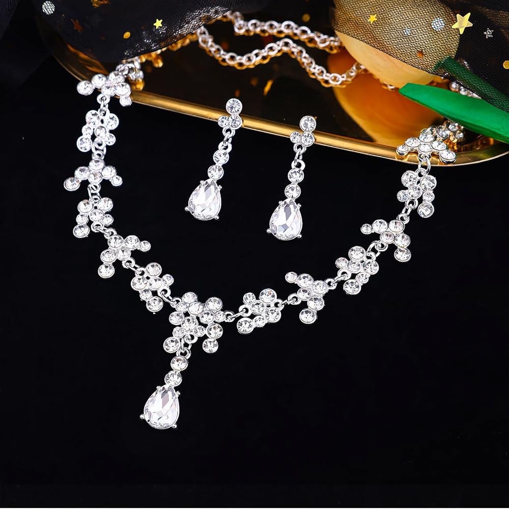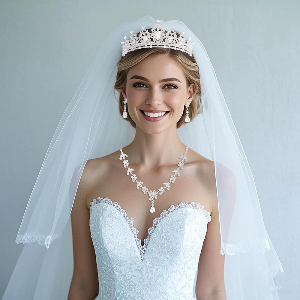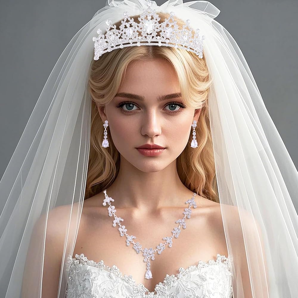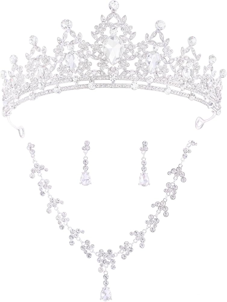 Size and Package: Our tiara jewelry set are suitable for adult women, Tiara diameter about: 5.7 inches, Height about: 2.2 inches, Weight about: 0.145 lb. The package includes a pair of earrings, necklace, clear box and two clips to fix the crown on your head and brings you a long and comfortable wearing experience.