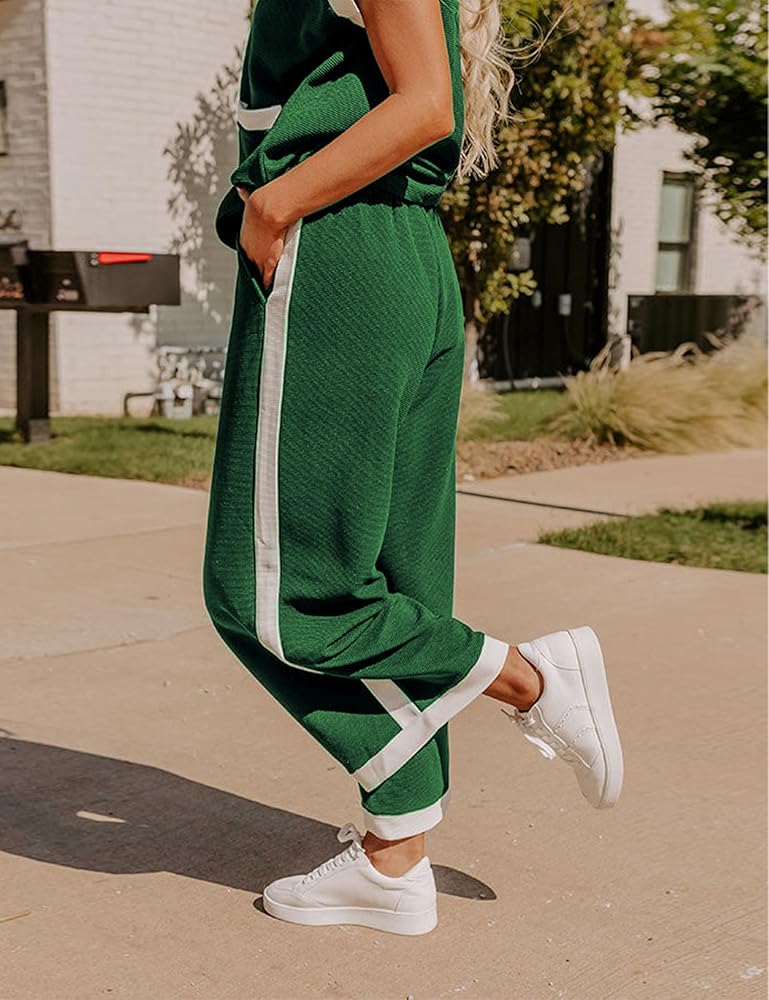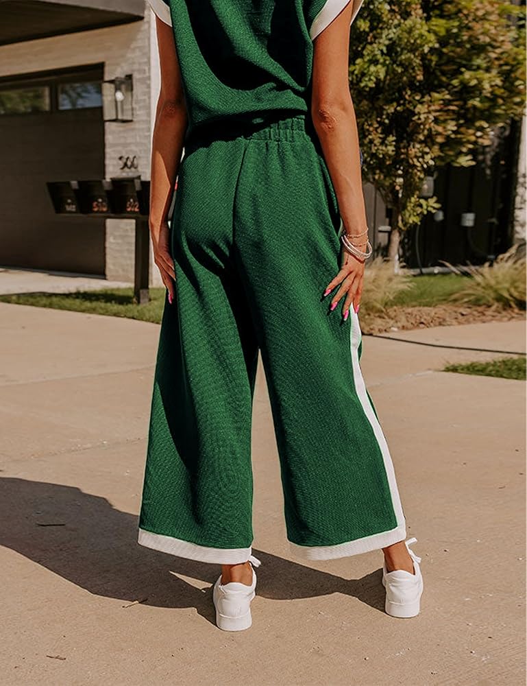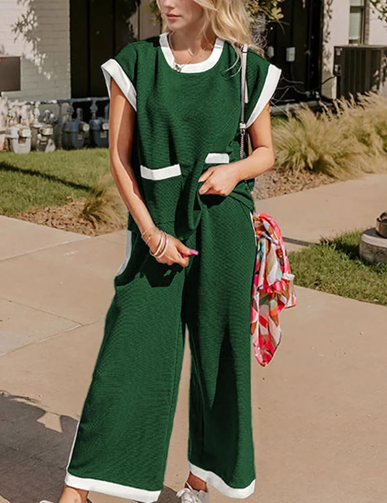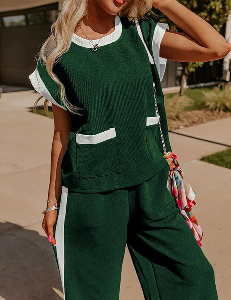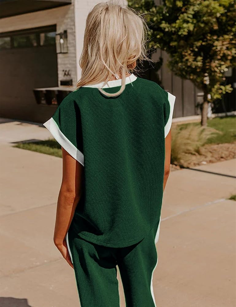 Feature: This sweater set is the perfect relaxed look. Flattering cut for women. The tops features a classic crew neck and breathable short sleeves, while the elastic-waist pants offer a relaxed fit without sagging.