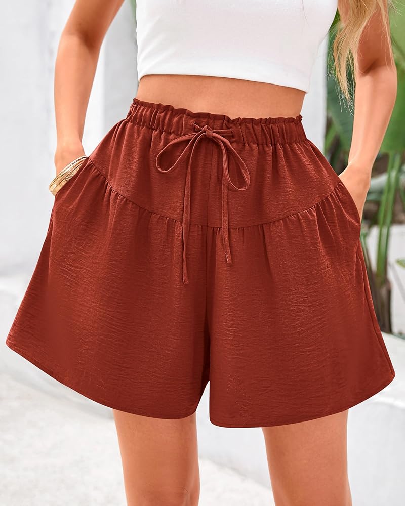 Features: Womens Shorts Casual / Drawstring Shorts Women / Elastic Waist Short Bottoms / High Waisted Shorts Women / Pure Color Shorts / Ruffle Shorts / Loose Shorts With Pockets / Tie Knot Shorts / Lightweight Boho Shorts / Wide Leg Shorts / Shorts For Women Trendy