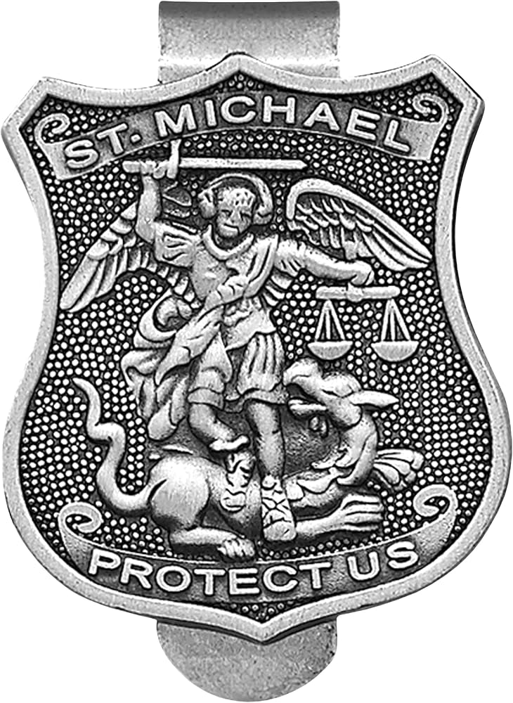 ST MICHAEL VISOR CLIP – A beautiful antique pewter patron saint of police, Policeman's Prayer St Michael shield clip, to watch over and protect you.
