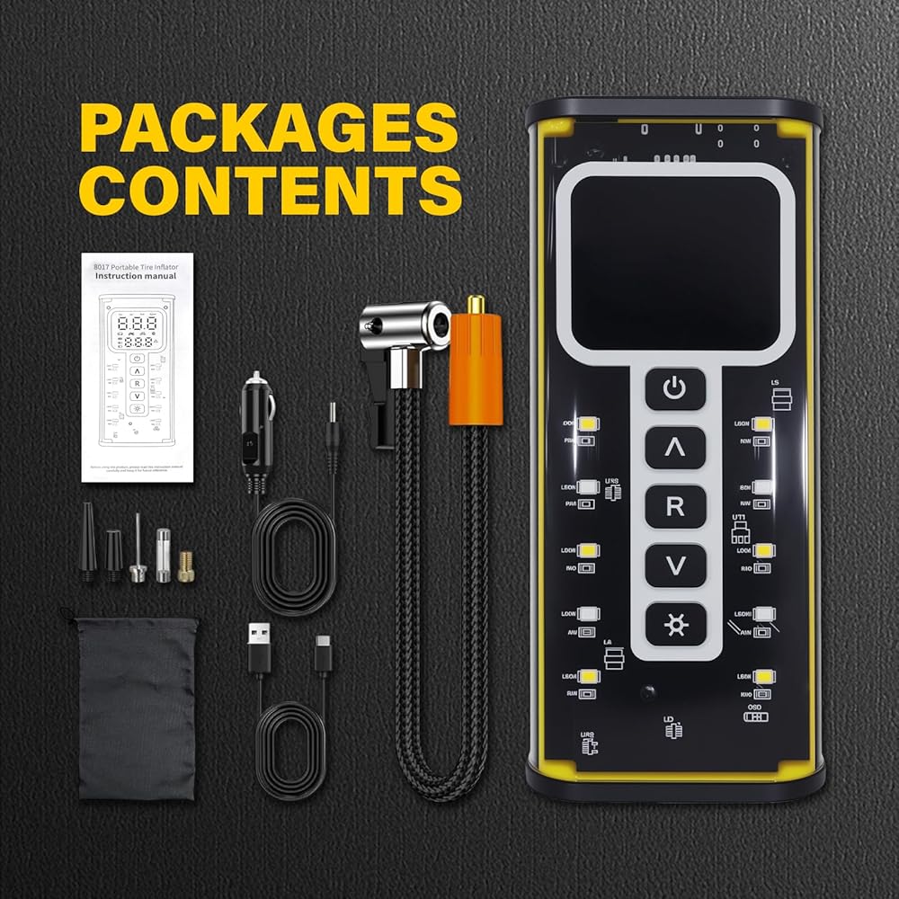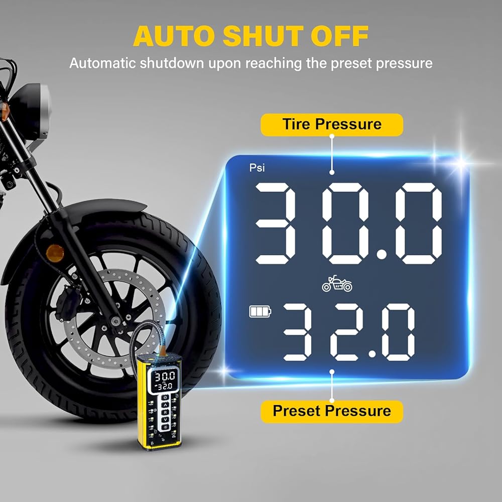 ✨ Accurate Dual Pressure Display: Featuring a clear display screen, the portable air compressor shows real-time and preset pressure values, automatically shutting off when the preset pressure is reached. Four pressure units: PSI, KPA, BAR, KG/CM².