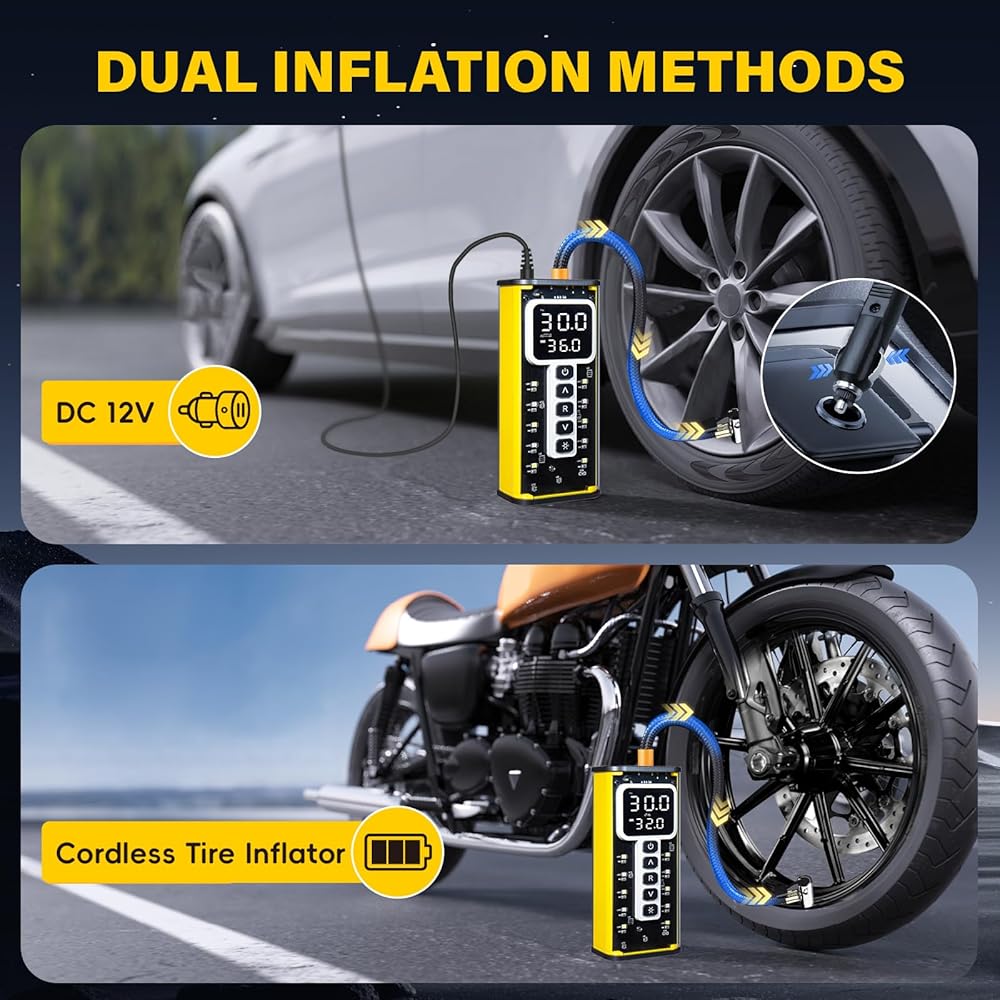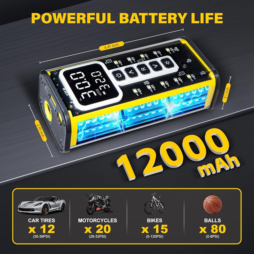🛞 4X Fast Inflation & 5 Modes: This tire inflator portable air compressor delivers a maximum 150 PSI & 35 L/min airflow, inflating a car tire (29-36 PSI) in under 1 min. Features 4 preset modes: car, motorcycle, bike, and ball.