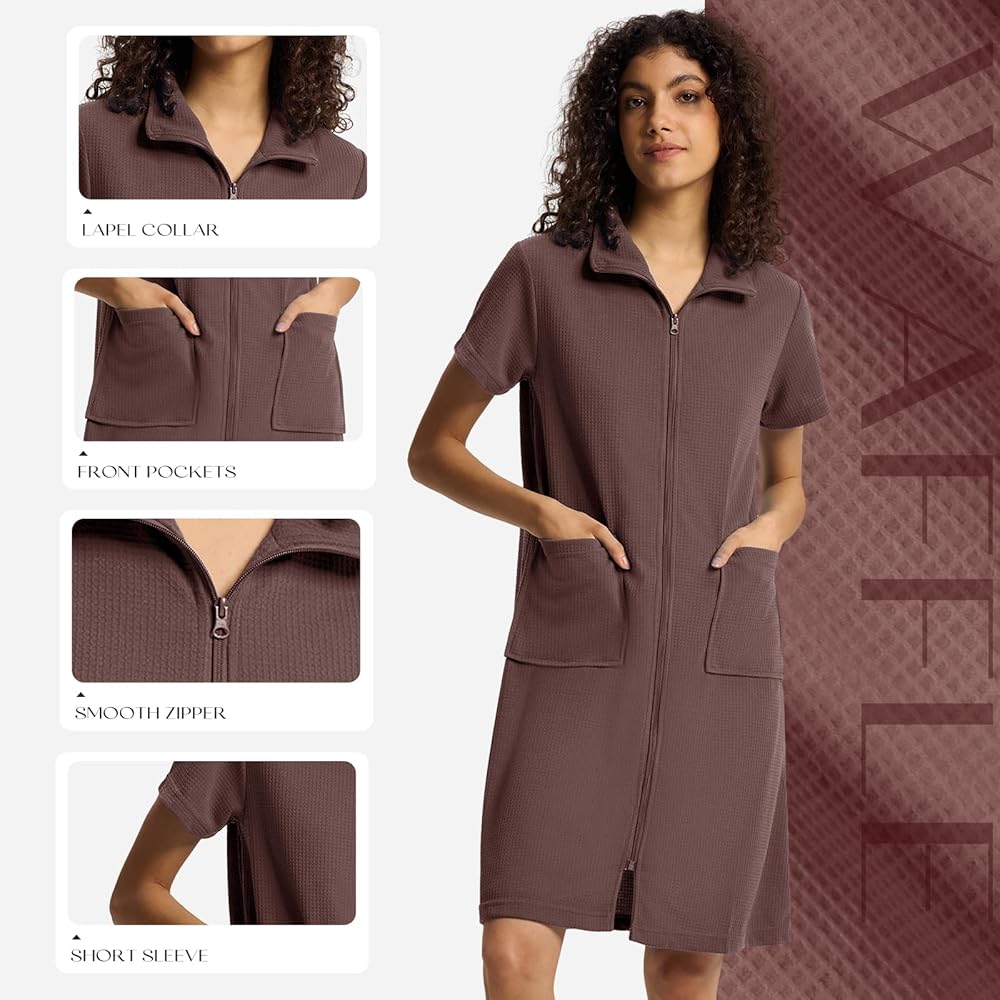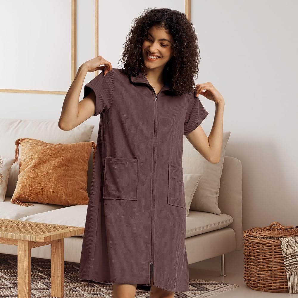 【Zipper Front Robe Design】Full Zip front bathrobes for women are easy to put on and off, and the convenience of a zipper allows your robe to stay securely closed and kept private. Suitable for any body type. The women's housecoat features short sleeves that are perfect for doing dishes or other chores. Smooth zipper house dress won't mess up your makeup or hair when taking it off or getting dressed.