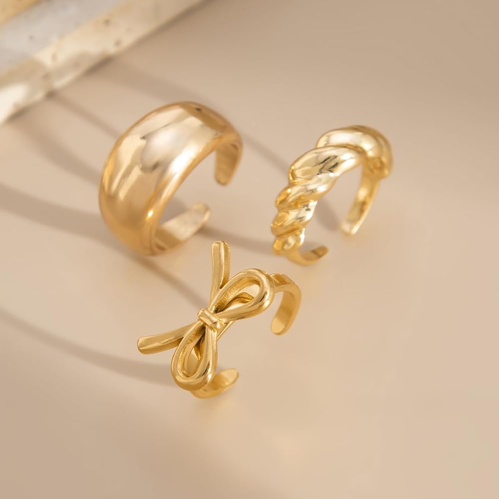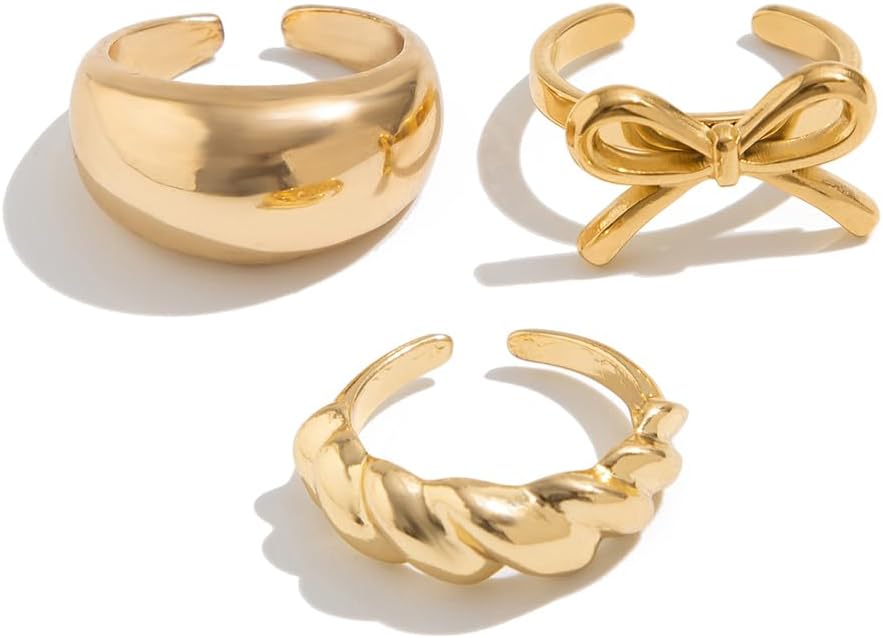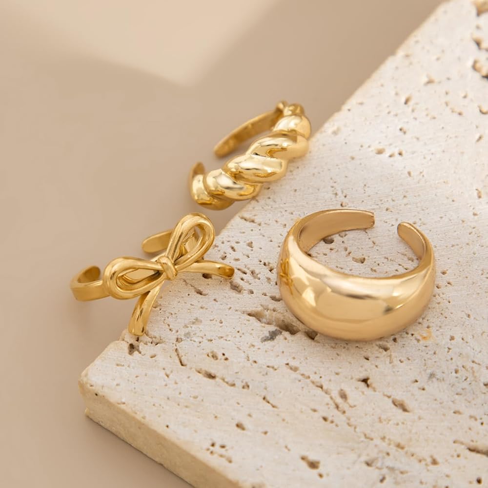 Ingemark Rings for Women 14K Gold Plated Chunky Teardrop Water Drop Ring Silver Adjustable Large Thick Smooth Curved Open Thumb Finger Rings 12 Pieces Bold Crossover Statement Ring Band