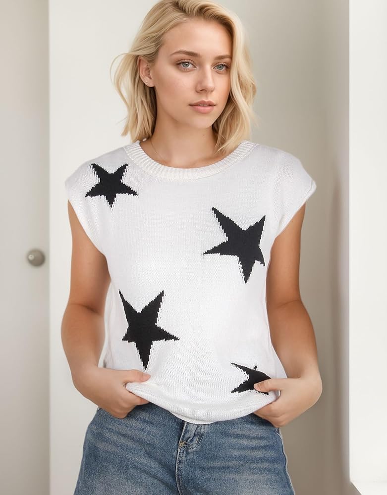 Feature: Womens cap sleeve sweater, crewneck sweater, vest sweater for summer, cute summer tops for women, star sweater for women, July 4th sweater, spring tops for women 2024.