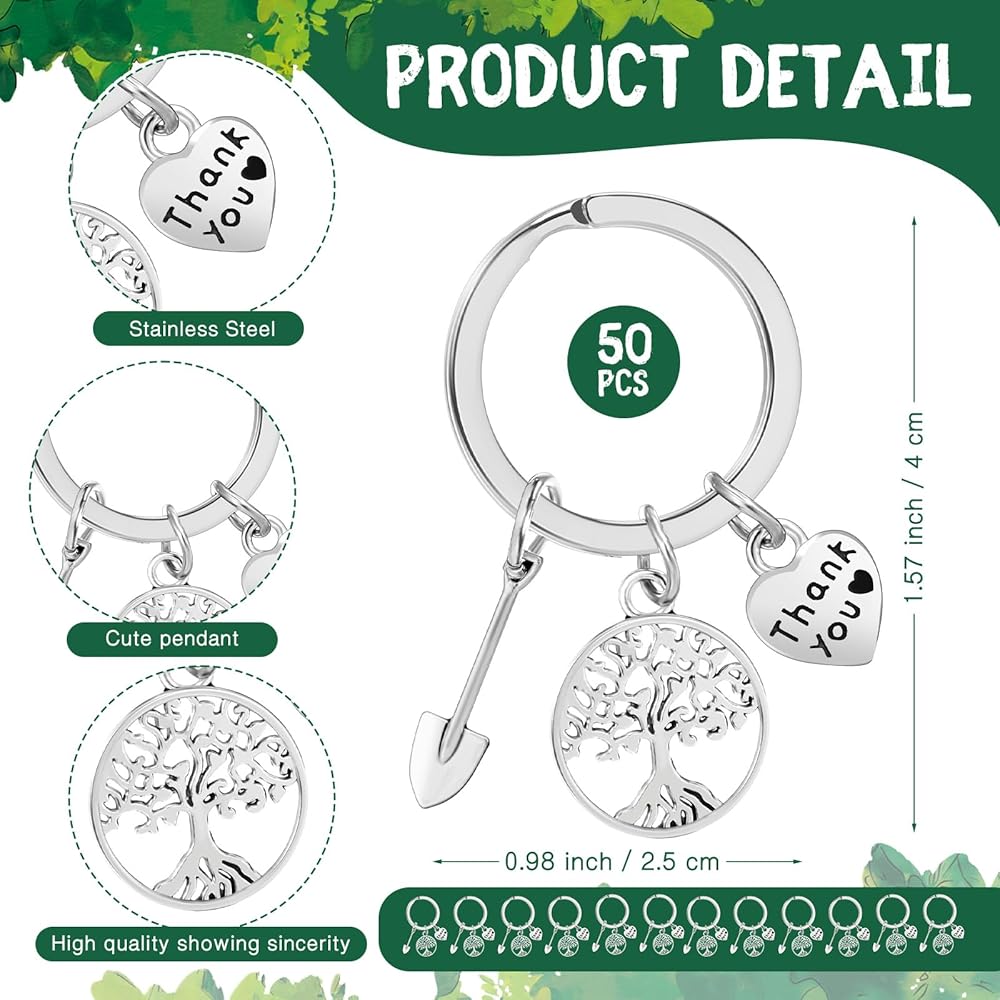 2025 Green Awareness Design: features 3 charms, a tree symbolizing growth, a heart with "Thank You" engraving for gratitude, and a mini shovel representing planting and nurturing; Each nature keychain comes with a beautifully designed card featuring the message, “Thank you for helping the earth stay green, one small plant at a time, ” to inspire eco conscious actions