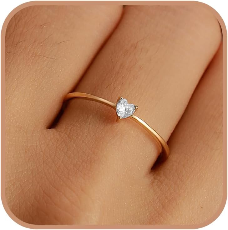 925 Sterling Silver Heart White Birthstone Ring for Women 14K Gold Plated Delicate Engagement Promise Rings to Daughter Mother Sister Minimalist Stackable Ring Wedding Mother’s Day Jewelry Gift for Her Size 5-7