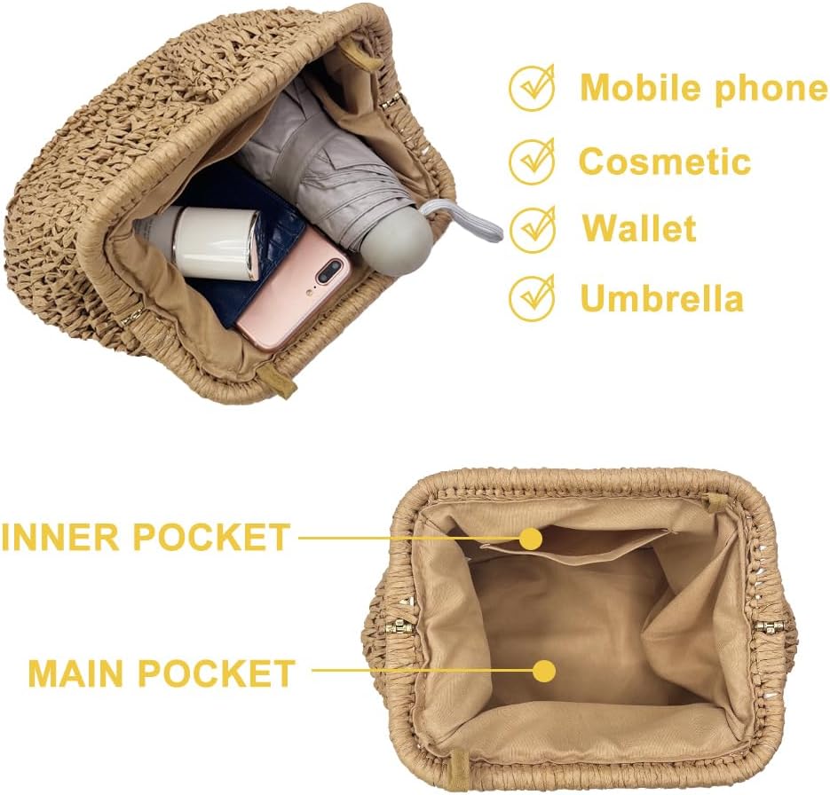 Quality Material: These small lightweight straw clutch purses for women are made of paper rope outside, and polyester fiber inside. The top metal handle part is fully wrapped by the paper rope .Quality Material: These small lightweight straw clutch purses for women are made of paper rope outside, and polyester fiber inside. The top metal handle part is fully wrapped by the paper rope .