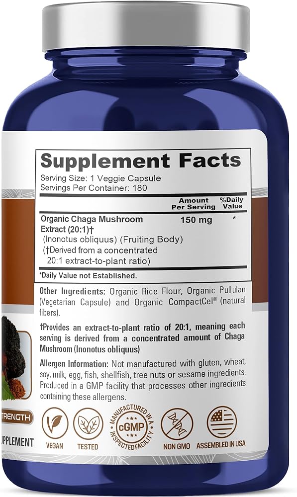 - Our product 20:1 extract equivalent to 3000mg of Organic Chaga Mushroom