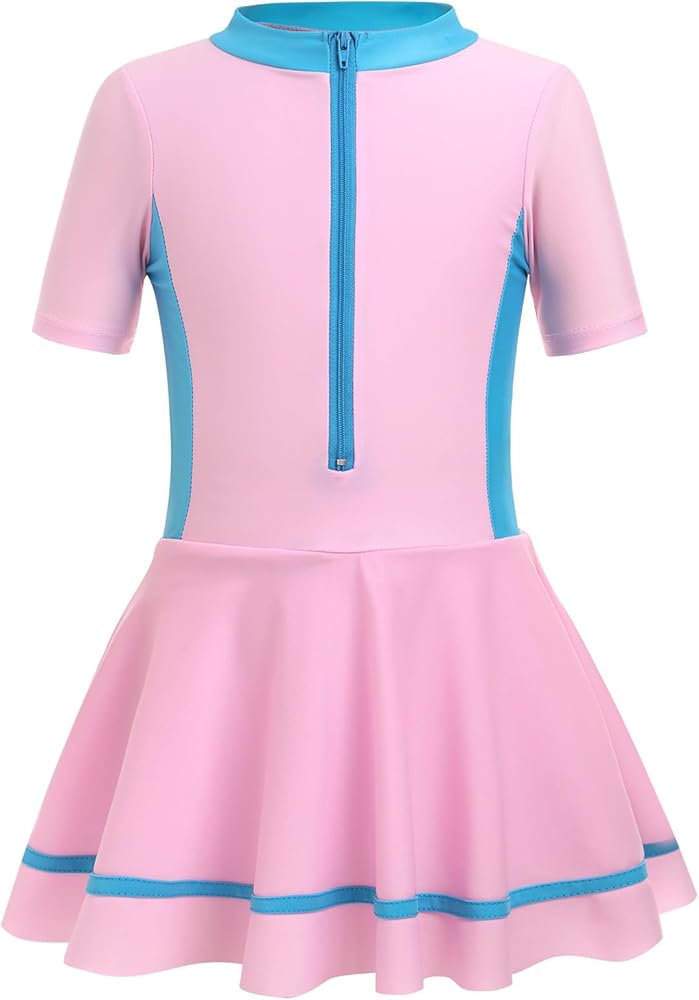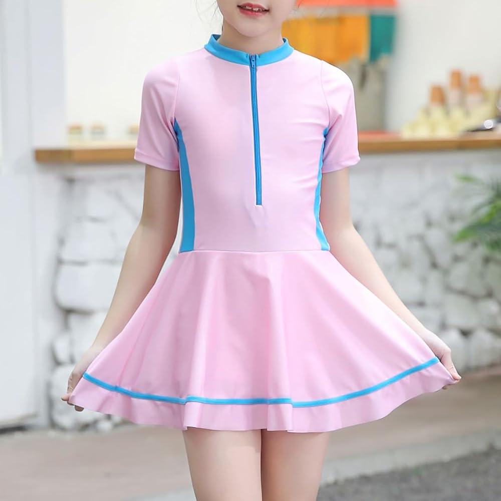 Girls Short Sleeve Rash Guard-Unique Design: Little girls short sleeve zip up swimsuits, color block swim dress with boyshorts swimming suit, crew neck with 1 2 zipper placket at front, convenient to put on or take off. Rashguard swimwear bathing suit for girl one piece swim dress with built-in shorts, unique color block for simple look. One piece bathing suits for teen girls swimwear rash guard, cute and lovely for your little girl.