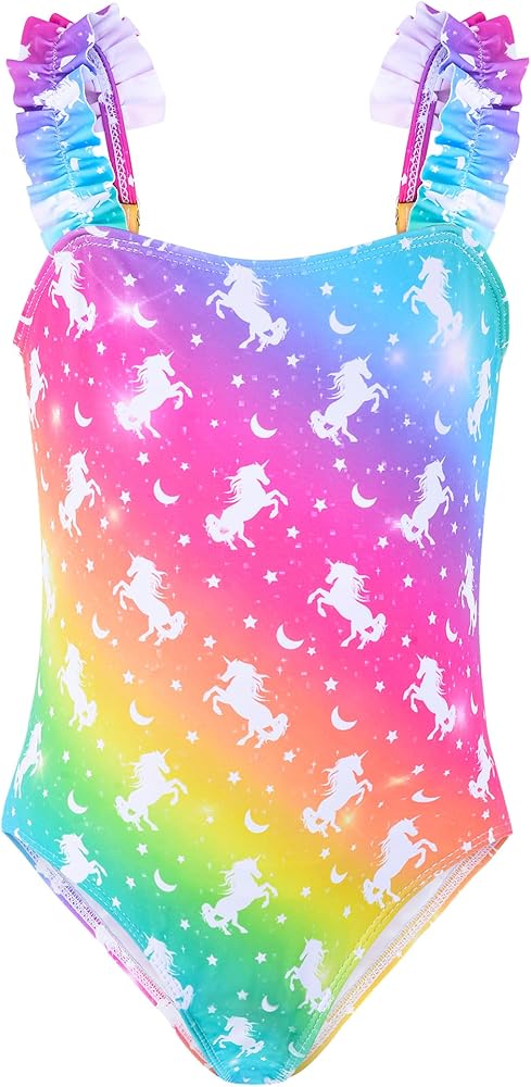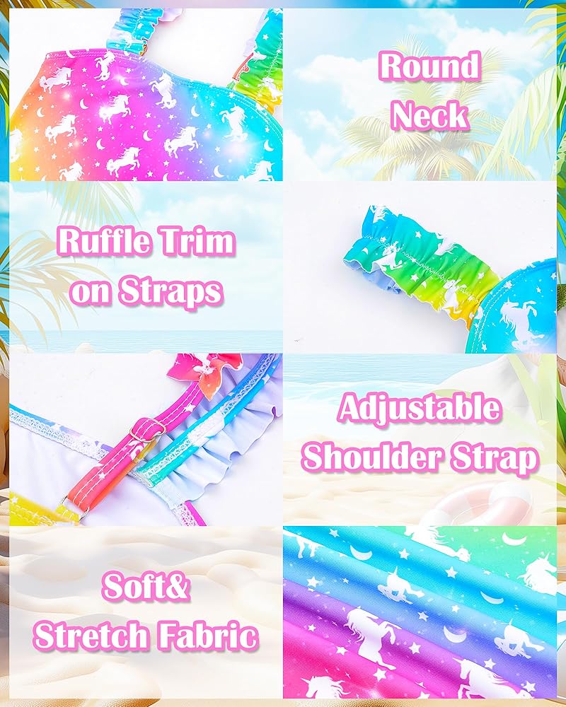UNIQUE DESIGN: soft texture, excellent abrasion, strong stretch, easy to put on and off. Quick drying girls one piece swimsuit with cute and ruffle trim on straps designs that girls' one-piece swimwear will make your little girl stand out in the crowd