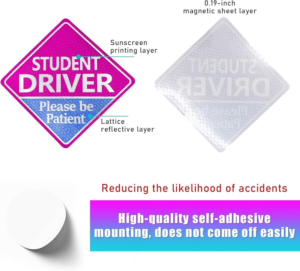 【Easy to Use】: You can stick the magnetic student driver sticker on your car's metal surfaces, and it will be automatically adsorbed firmly. And when using the adhesive student driver sticker, you need to tear off the protective film on the back, then stick it on your car, and it is not easy to fall off after sticking.