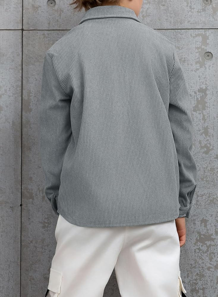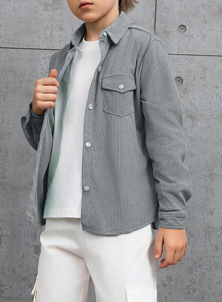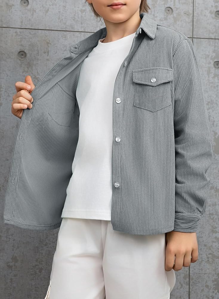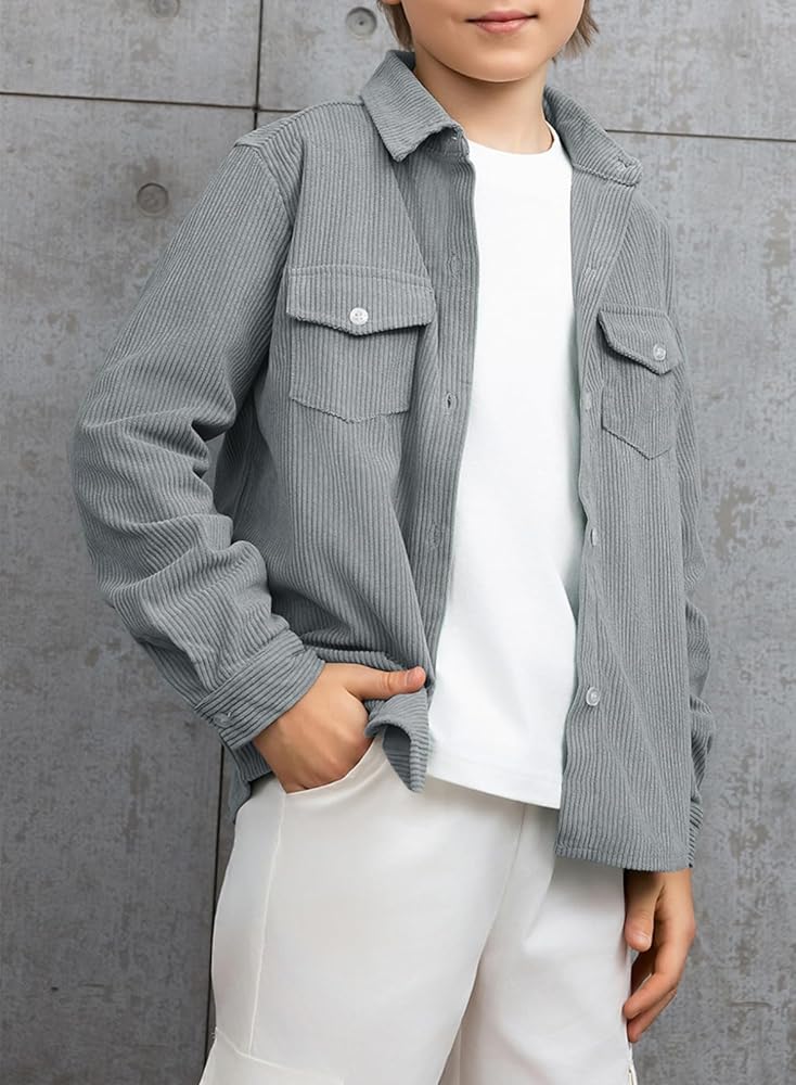 FEATURE: Corduroy Fabrication, Solid Color, Turn-Down Collar, Long Sleeves with Button Cuffs, Button Closure, 2 Chest Pockets, Basic Style, Boys Loose Fit Outfits.