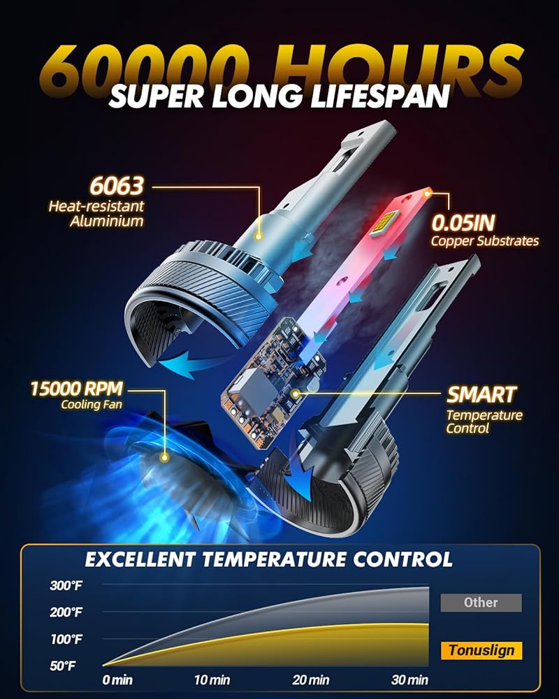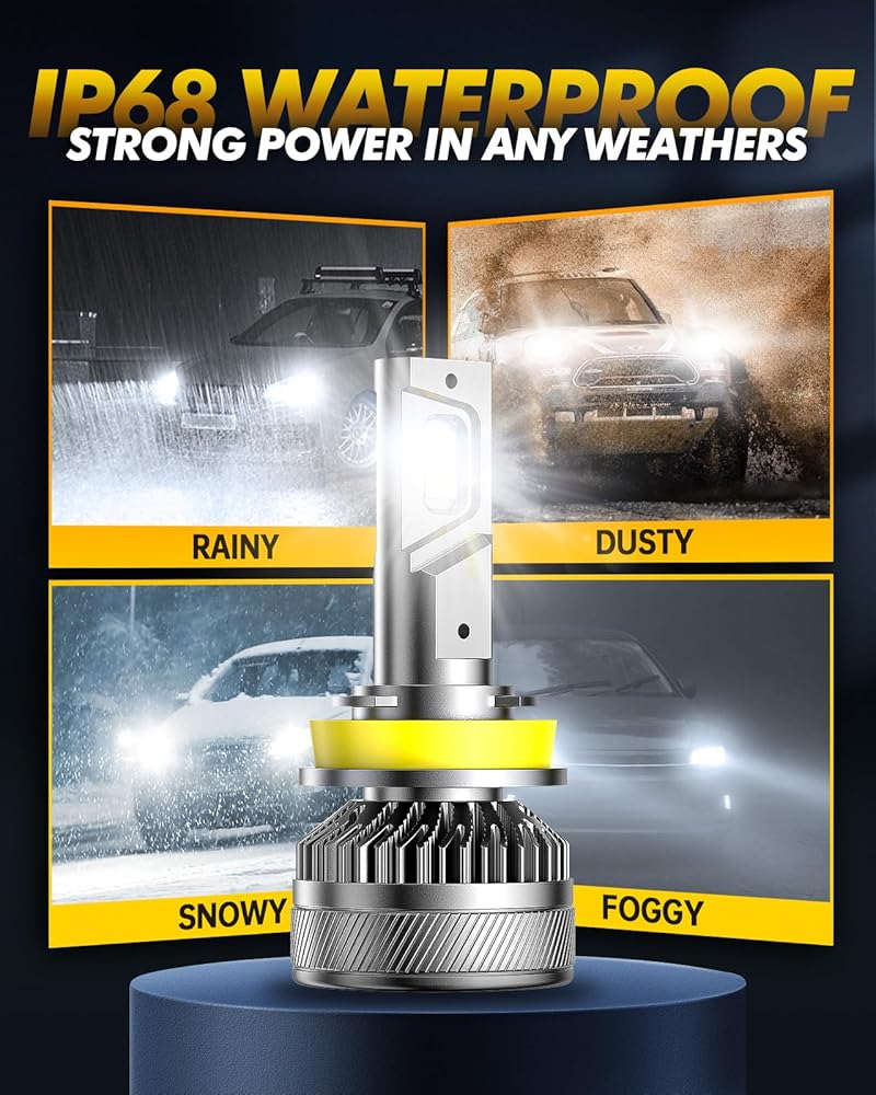 60000 Hours Lifespan - With a durable aviation aluminum body, a unique hollow-carved heat sink design, and a 15,000 RPM turbo cooling fan, our 9005 H11 driving light bulbs combo offers superior cooling capabilities, ensuring a lifespan of up to 60,000 hours.