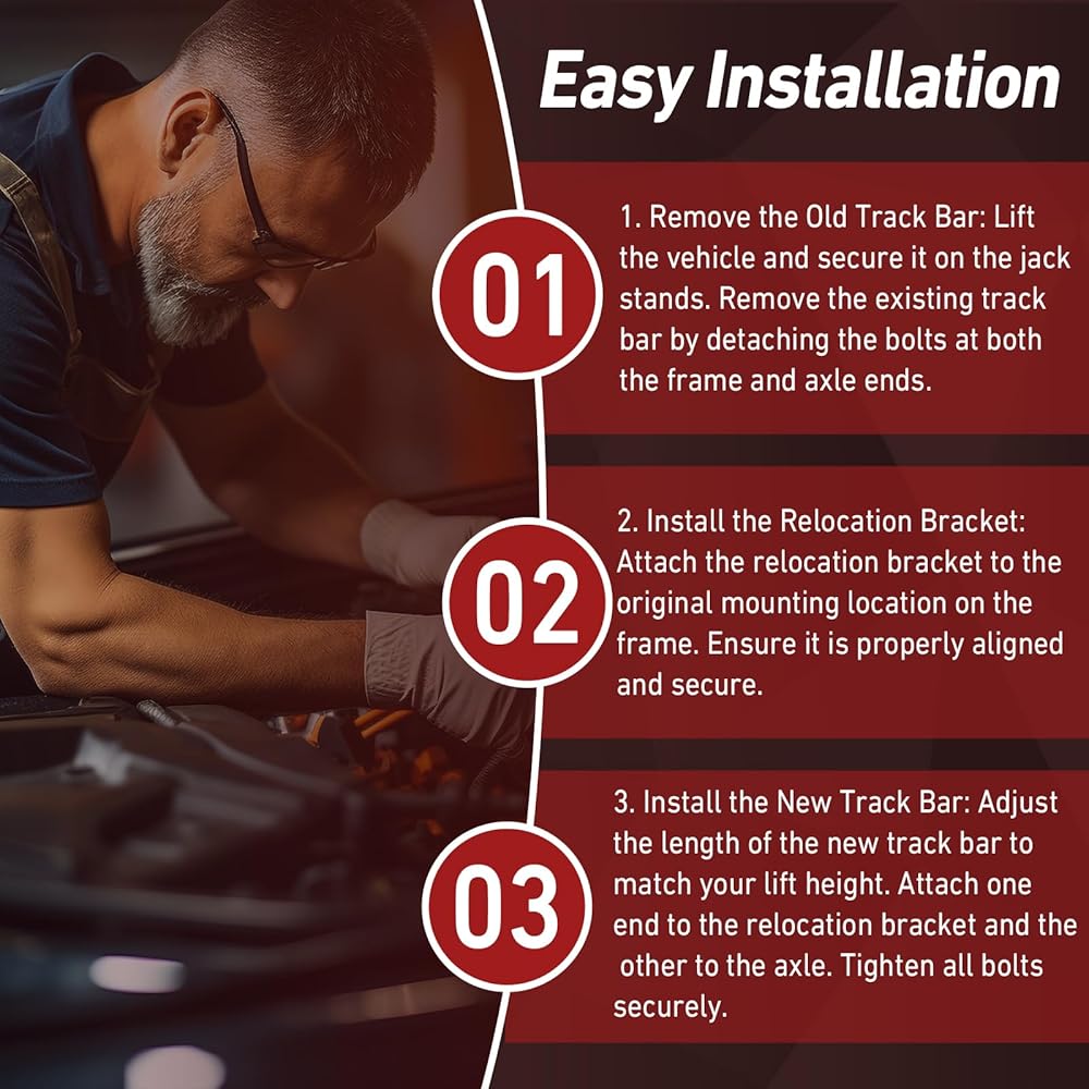 Adjustable Design for Optimal Performance:The front track bar features an adjustable length of 790-830 mm eyelet-to-eyelet and includes a relocation bracket. This allows for easy adjustment to match your lift height, ensuring the axle remains centered and reducing issues like bump steer and steering wobble.