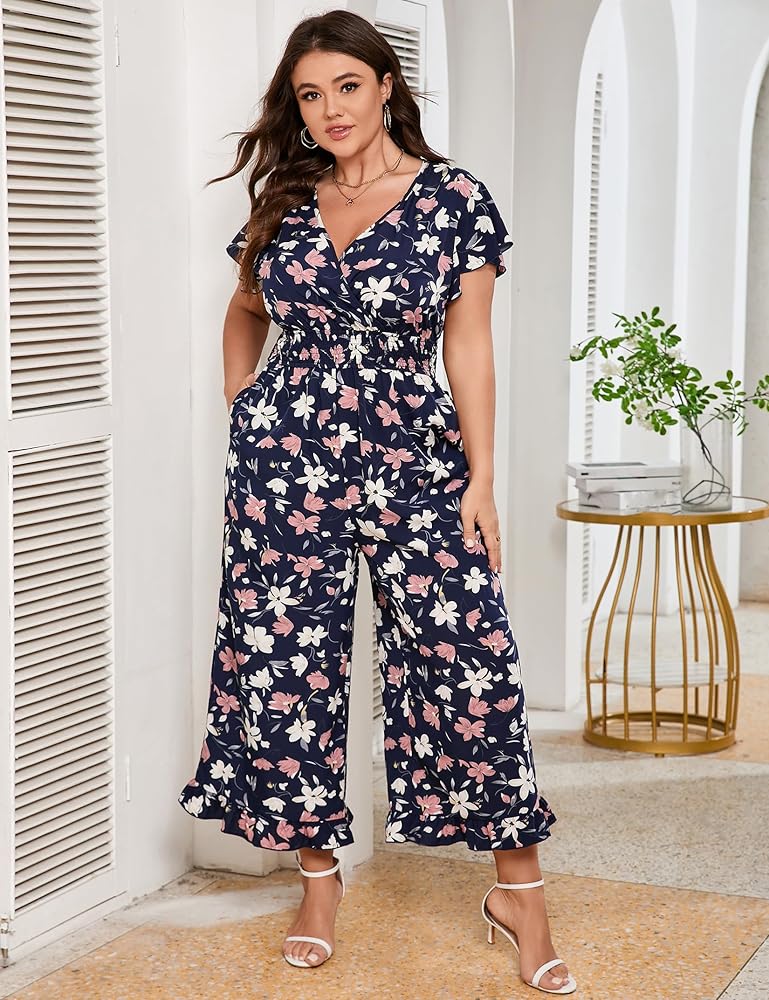 【Stylish Design】Plus size jumpsuits for women summer have wrap v neck,wide leg,short sleeve,smocked on waist and ruffle hem on leg.Swing and sweet.