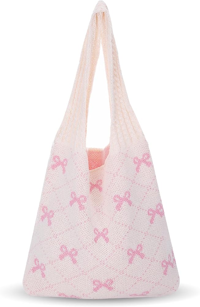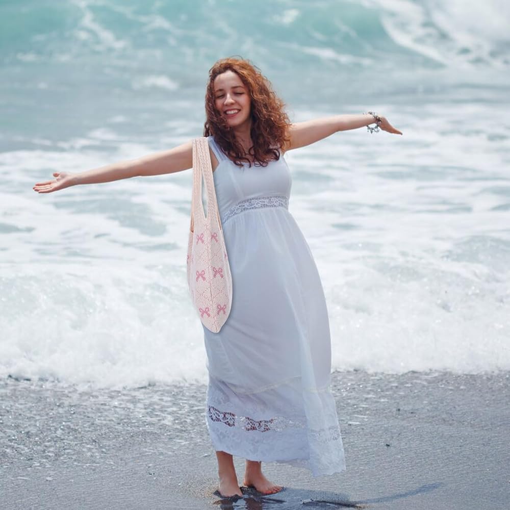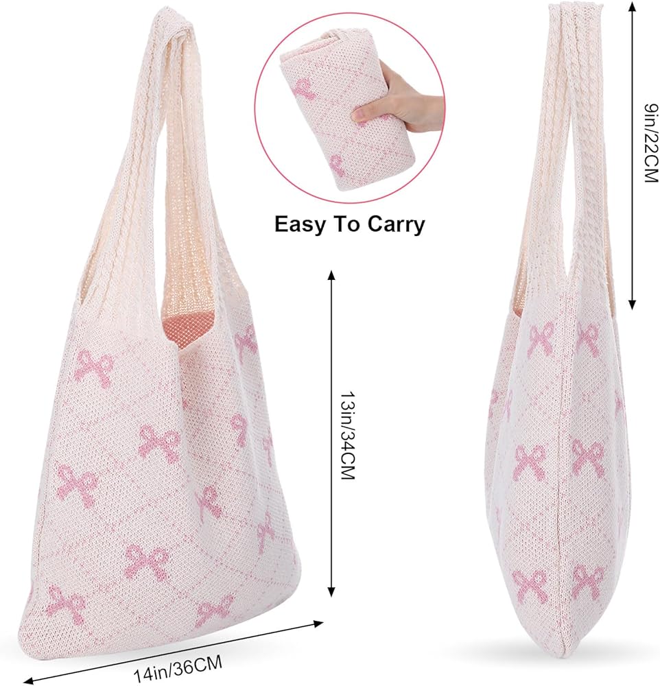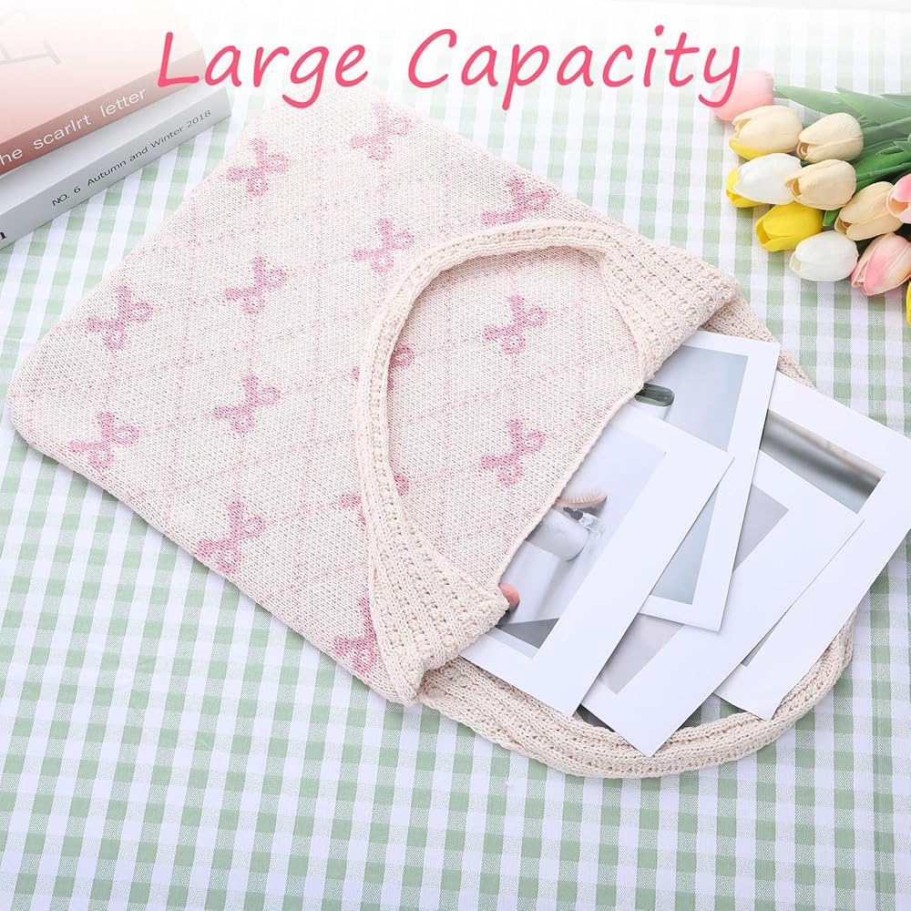 Cute Tote Bags for Women: This aesthetic tote bag is printed with a cute pink bow on a soft cream background. This hobo tote bag is not only suitable for daily wear, but also perfect for beach seaside vacation, add a playful and fashionable touch to your outfit.