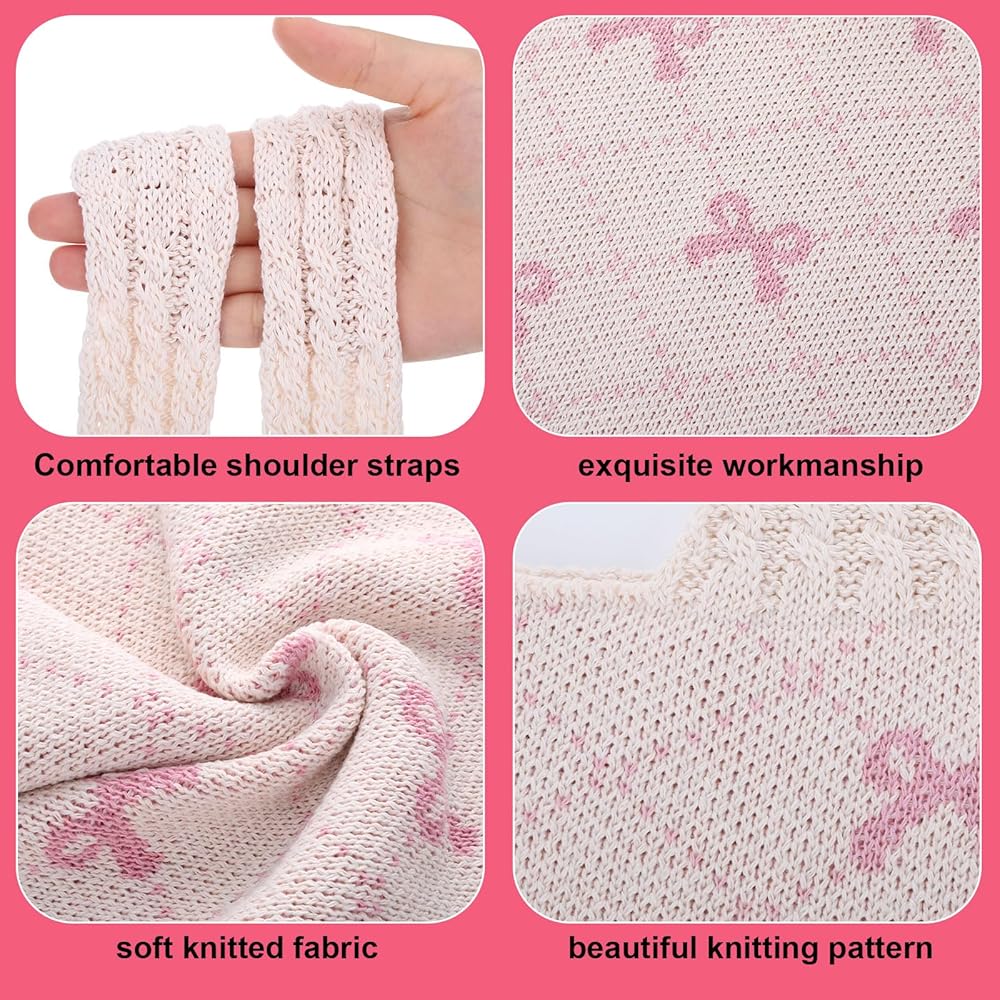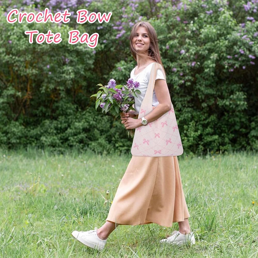 ⭐This beautifully crafted crochet tote bag features a pink bow pattern on a cream background, casual and versatile.