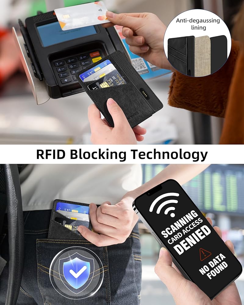 Safe rfid blocking wallet: this slim rfid card holder is equipped with advanced rfid blocking technology, which can block 13.56 mhz or higher rfid signals and protect the valuable information stored on rfid chips from unauthorized scans. Ensure the security of your personal information while you are traveling, hiking, shopping