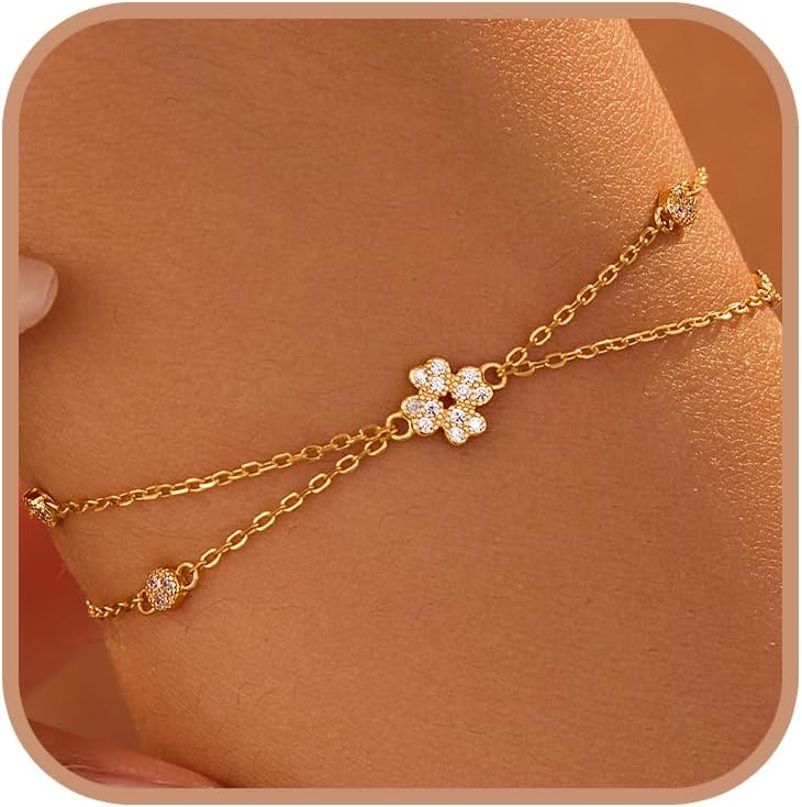 Stackable Double Layer Cross Elegance Bracelets:Cross Two dainty chains with a 3D textured flower pendant create dimensional layering. Mix with other bracelets or wear solo for minimalist style.