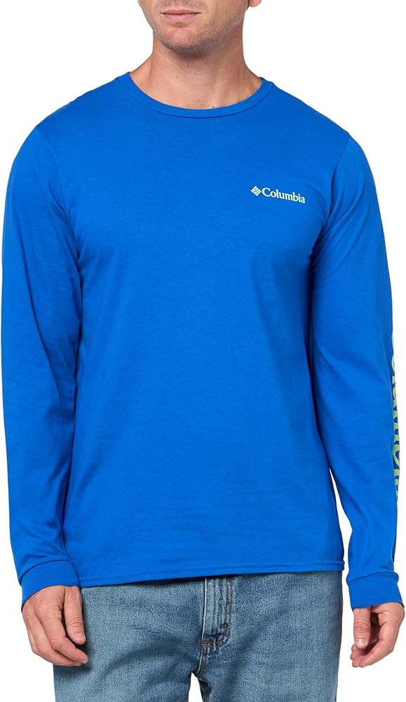 - Mens Columbia long sleeve 100% cotton tee, features the Columbia Fundamentals Sportswear logo on the chest and down the sleeve, and a crew neckline.
