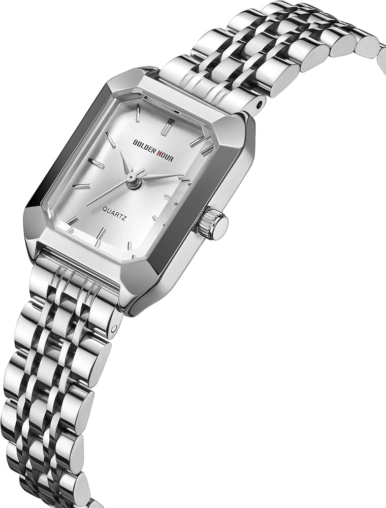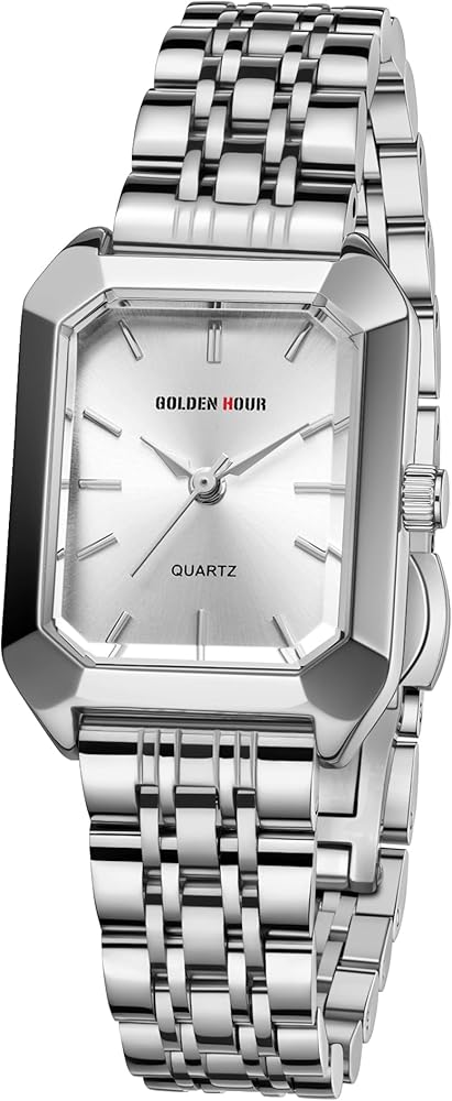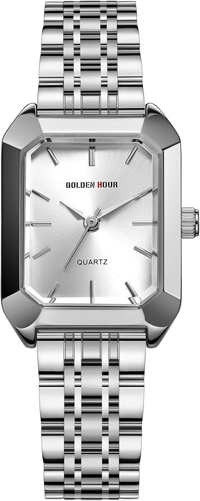 - ELEGANT DESIGN: Rectangular gold-tone case with a sophisticated silver dial featuring minimalist hour markers and hands for a timeless look