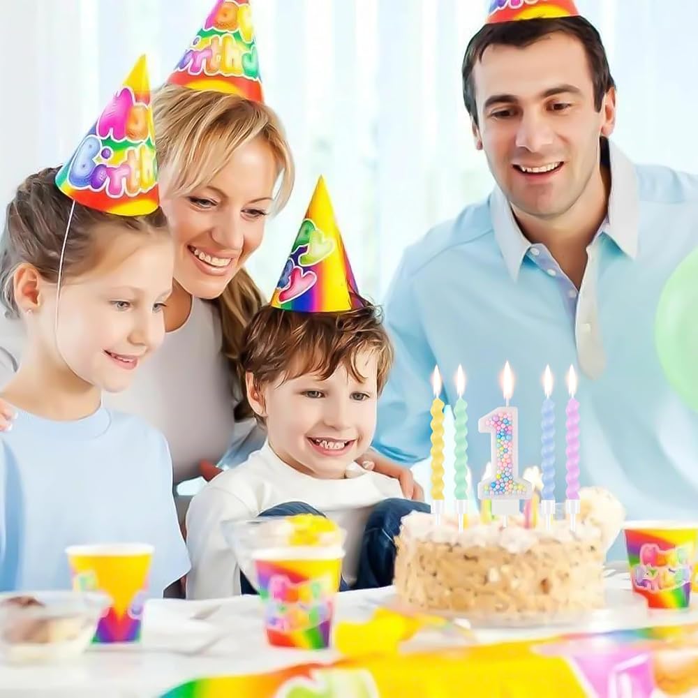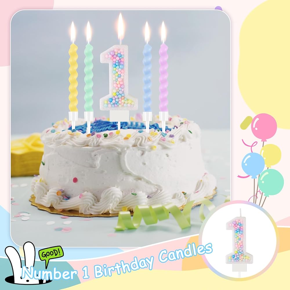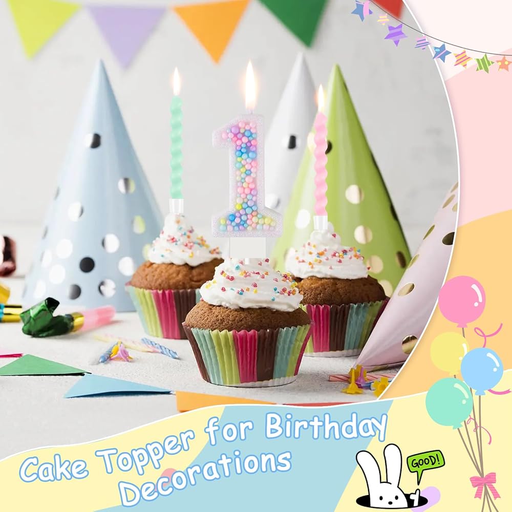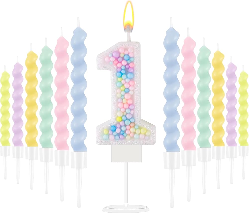 Rainbow Number 1 Birthday Candle 3D Macaron Glitter Number 1 Candle Pastel Pink Birthday Cake Candles with 12 Pcs Long Spiral Cake Candles for Girls Boys Cakes Topper Wedding Anniversary Theme Decor
