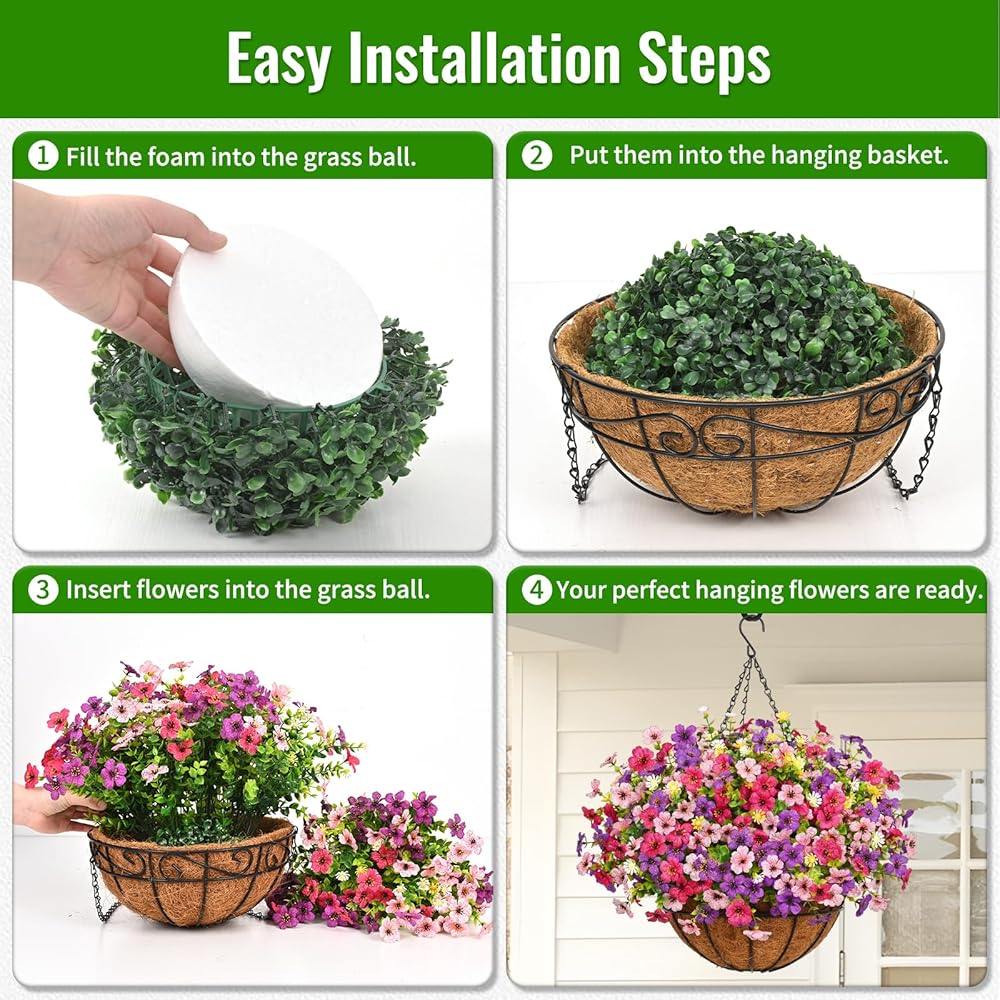 Value-Packed Set for Lush Decor: Transform your outdoor space with our artificial hanging flowers for outdoors set, featuring a 12-inch coconut basket, chain, semicircular grass ball, foam base, and 12 vibrant bundles of mixed-color artificial flowers for outdoors, their combination creates a lush and abundant display that adds instant charm to any setting.