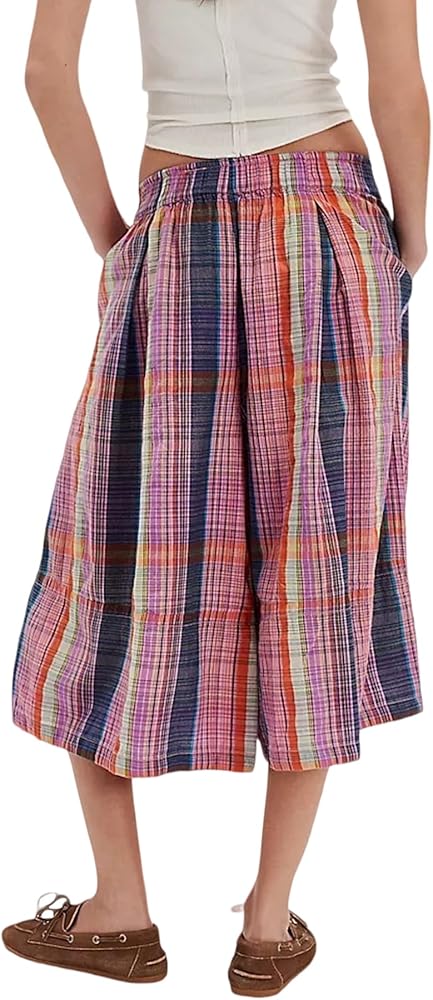 Features: Flowy palazzo pants with mid-rise, wide leg, stylish bohemian plaid pattern, featuring with colorful block plaid pattern, cropped length, elastic waist and wide leg with side pockets, loose fit, casual style, offer great flexibility and freedom of movement