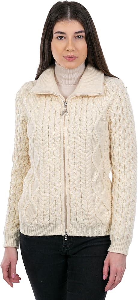 Traditional Aran Stitches Design with a modern appearance - our jacket presents the traditional Aran Cable stitch complemented with a stylish Hugs & Kisses stitch near the zipper, Diamond patterns arranged vertically, and an exquisite Honeycomb on the sleeves.