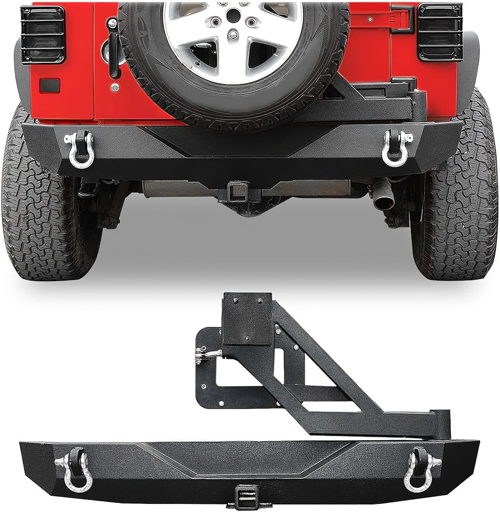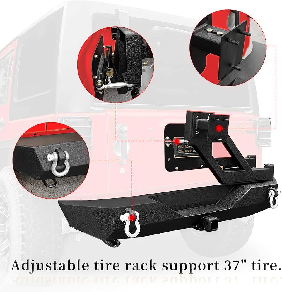 【HEAVY DUTY】This Bumper was designed to add protection to your precious Jeep's lower rear end while providing it with superior towing capabilities with its heavy-duty D-rings. Adjustable spare tire rack for tires up to 37" and the extra rubber ensures quiet operation. High quality textured powder coat for corrosion protection and durability.