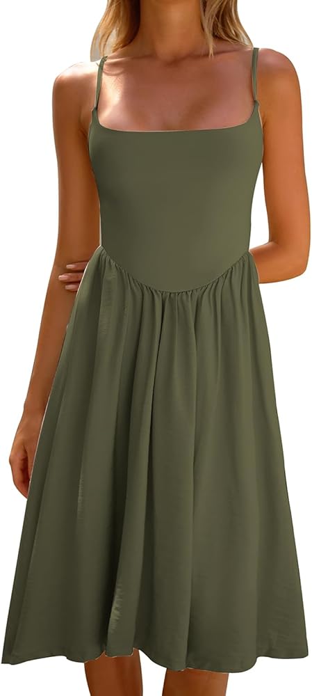 The midi dress Features a flattering scoop neckline that adds a touch of effortless elegance to your casual summer look.Thin spaghetti straps allow for a customizable fit and add a delicate feminine vibe to the sleeveless silhouette.Elegant Curved Design: The unique curved design on the front of the dress creates a stylish, eye-catching detail that enhances its modern, feminine appeal.