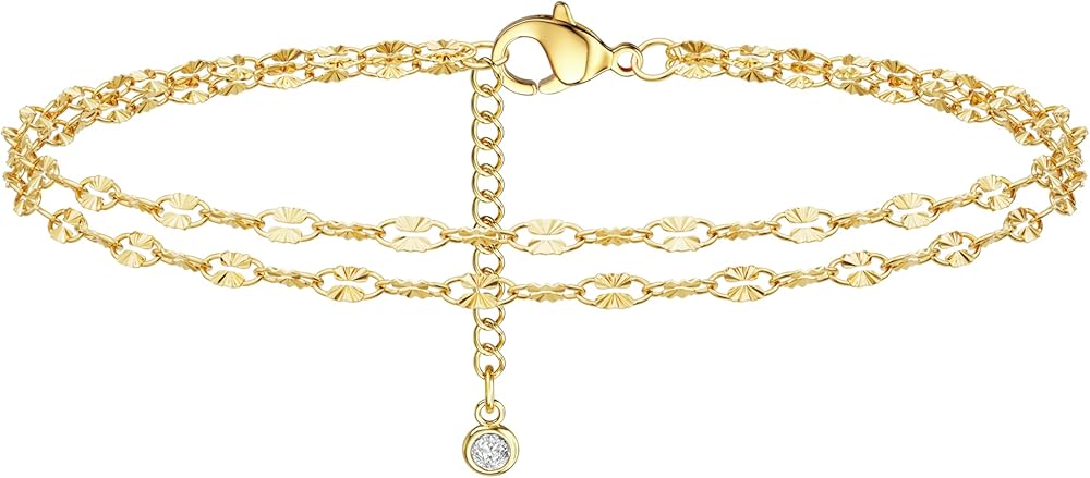 [Material Safety Layered Anklets] 14K real gold filled over brass to ensure long lasting, waterproof and hypoallergenic, lead and nickel free, simple and elegant, 8.5" delicate anklet design with lobster clasp and 2.5" delicate extension chain, easy to wear and adjustable