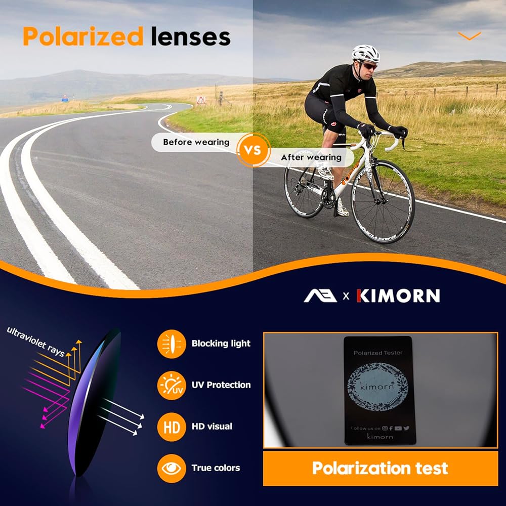KIMORN Vision lenses can block both UVA and UVB radiation. UV400 rated sunglasses is essential to protecting your eyes against long term UV damage and keeping your eyes healthy when you go out.