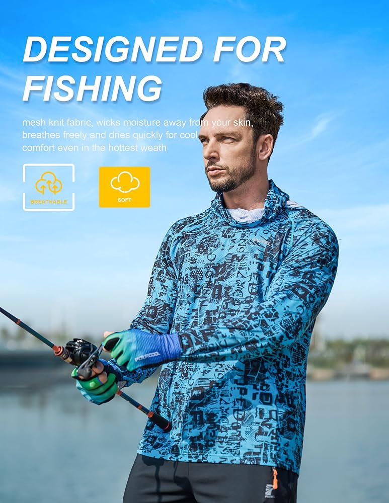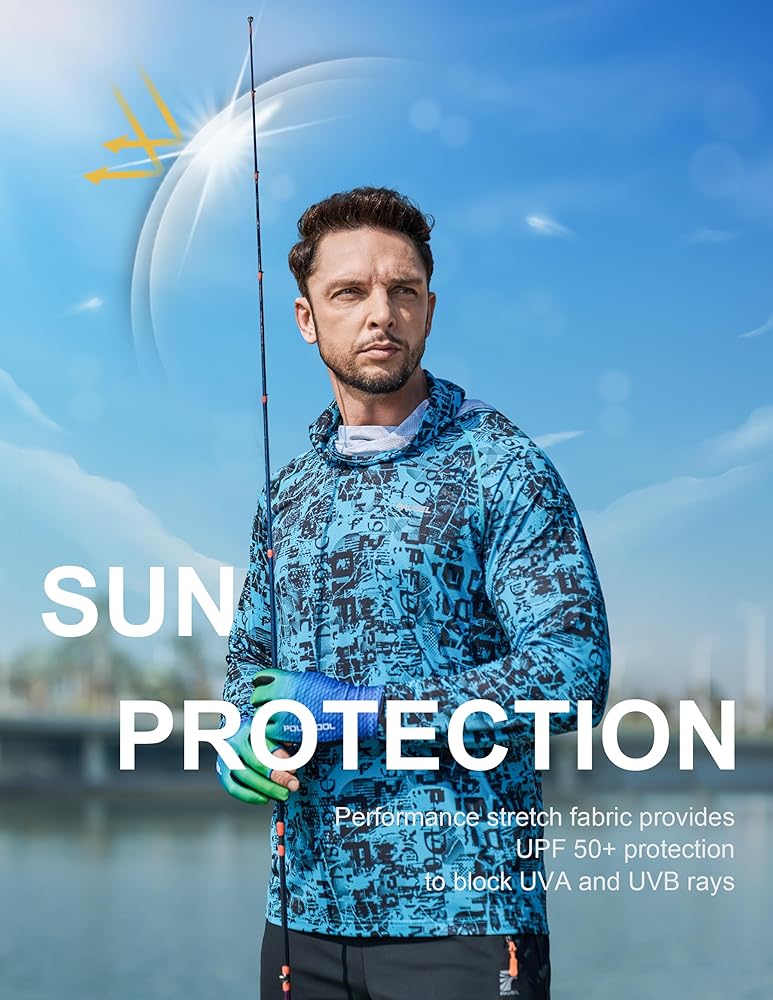 Great Sun Protection: The mens fishing shirts hoodie with UPF 50+ blocks UVA and UVB rays, protects your skin and neck from the sunburns and long term skin damage while