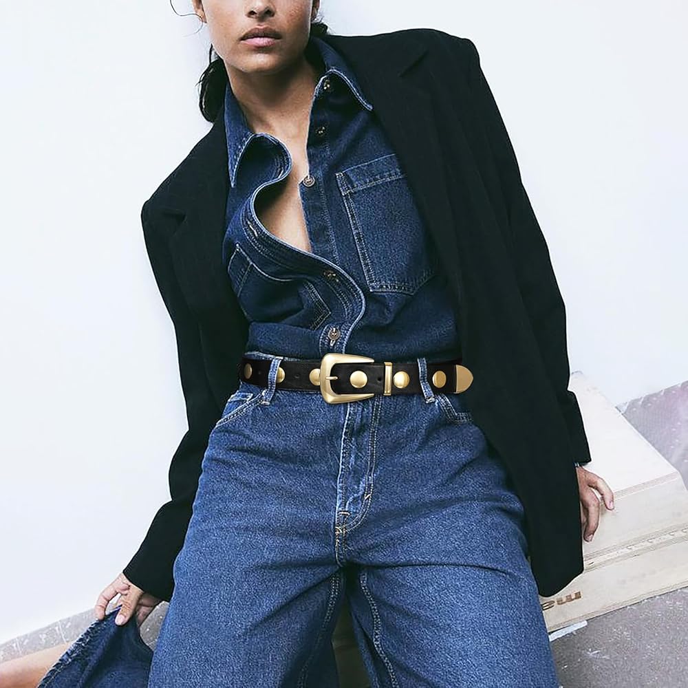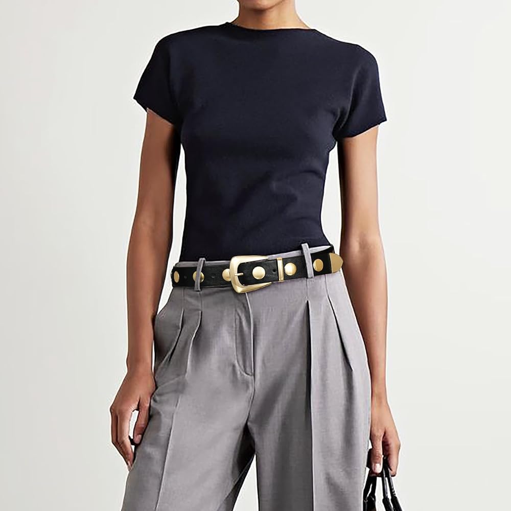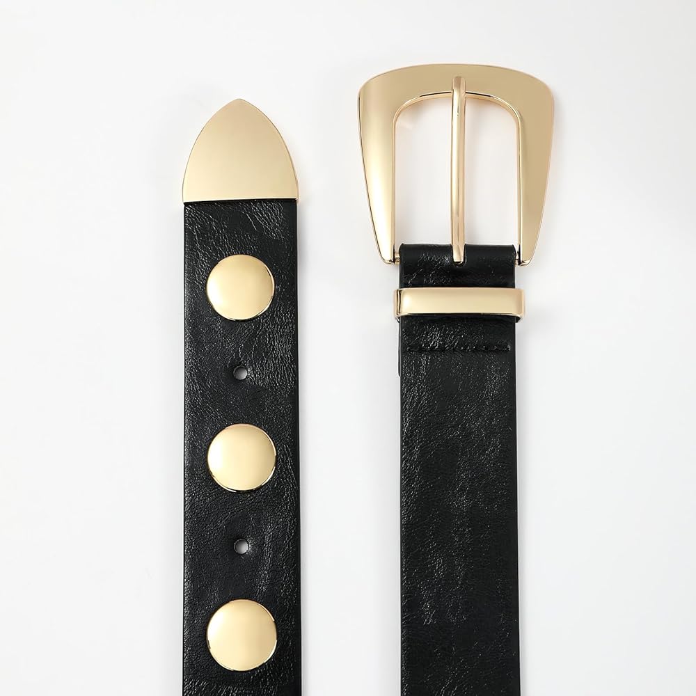 【Risantry's Exclusive Design】This women black belts, a new design by Risantry, radiates elegance. Made of premium synthetic leather, its black surface contrasts beautifully with the shiny gold buckle and accessories. Each gold detail glistens, making it a remarkable Designer belt in the fashion belts world.