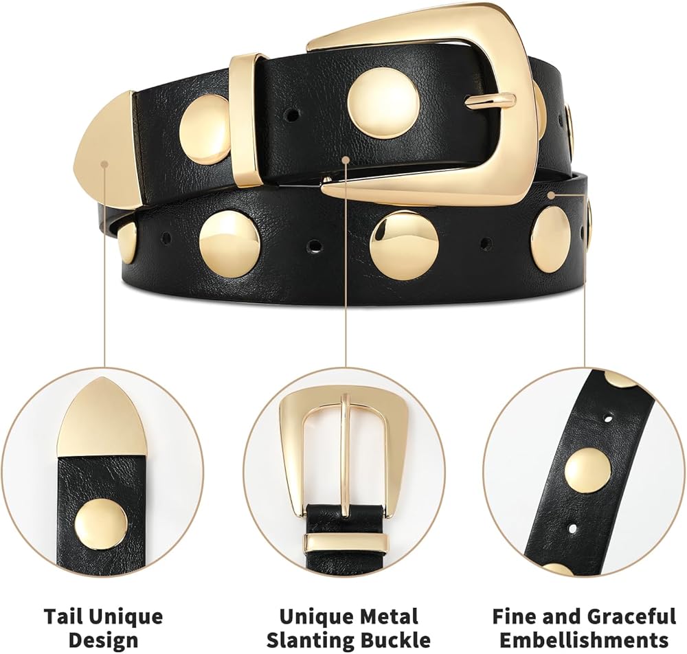 【Mesmerizing Metallic Allure】Crafted with care, this womens' belt shows top - notch workmanship. The high - quality synthetic leather is soft and durable. The gold metal parts are well - polished, boasting a long - lasting luster. It's a blend of quality material and fine making.