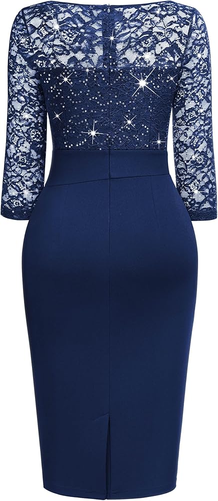 Features: Sequined Lace, Scoop Neck, 2/3 Sleeve, Floral Lace Contrast, Above Knees, Slim Cutting, Hidden Zipper On The Back.