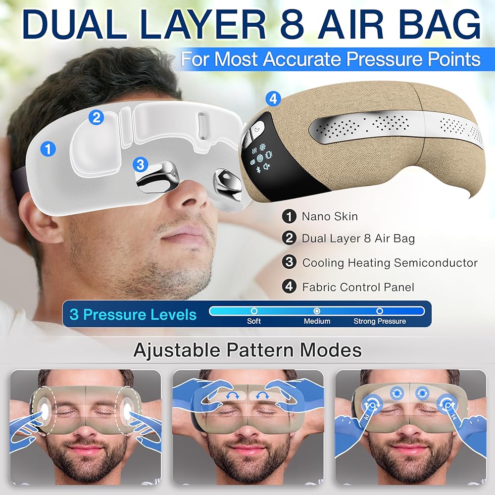AIR PRESSURE VIBRATION - This portable eye massager pressure eye provides moderate air compression and vibrating power. The heat compress feature also help improve dark circles & achieve healthier eyes